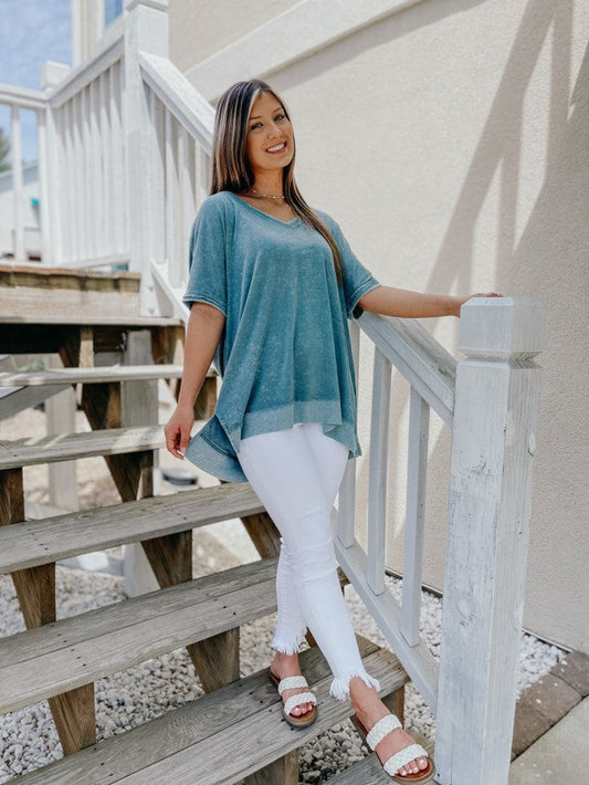 Teal Blue V-Neck Side Slit Short Sleeve Knit Top