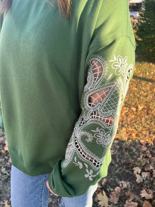 Romantic Lace Embroidered Sleeve Sweatshirt| Green