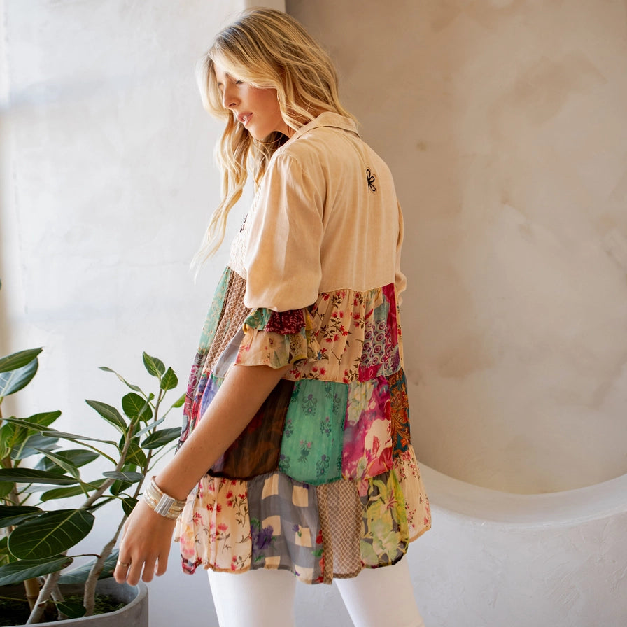 Indulge in some retro fashion with our 3/4 Ruffle Sleeve, Elouise Ruffle Blouse Top! Inspired by the 1960s, this blouse features a gathered waist for a flattering silhouette and vintage charm with its ruffled sleeves. The exquisite hand aari embroidery on the top yoke and floral prints on the lower portion add a unique touch. Made with gravel double-dyed fabric and an overdyed, stone-washed finish, this blouse is a timeless fashion statement.