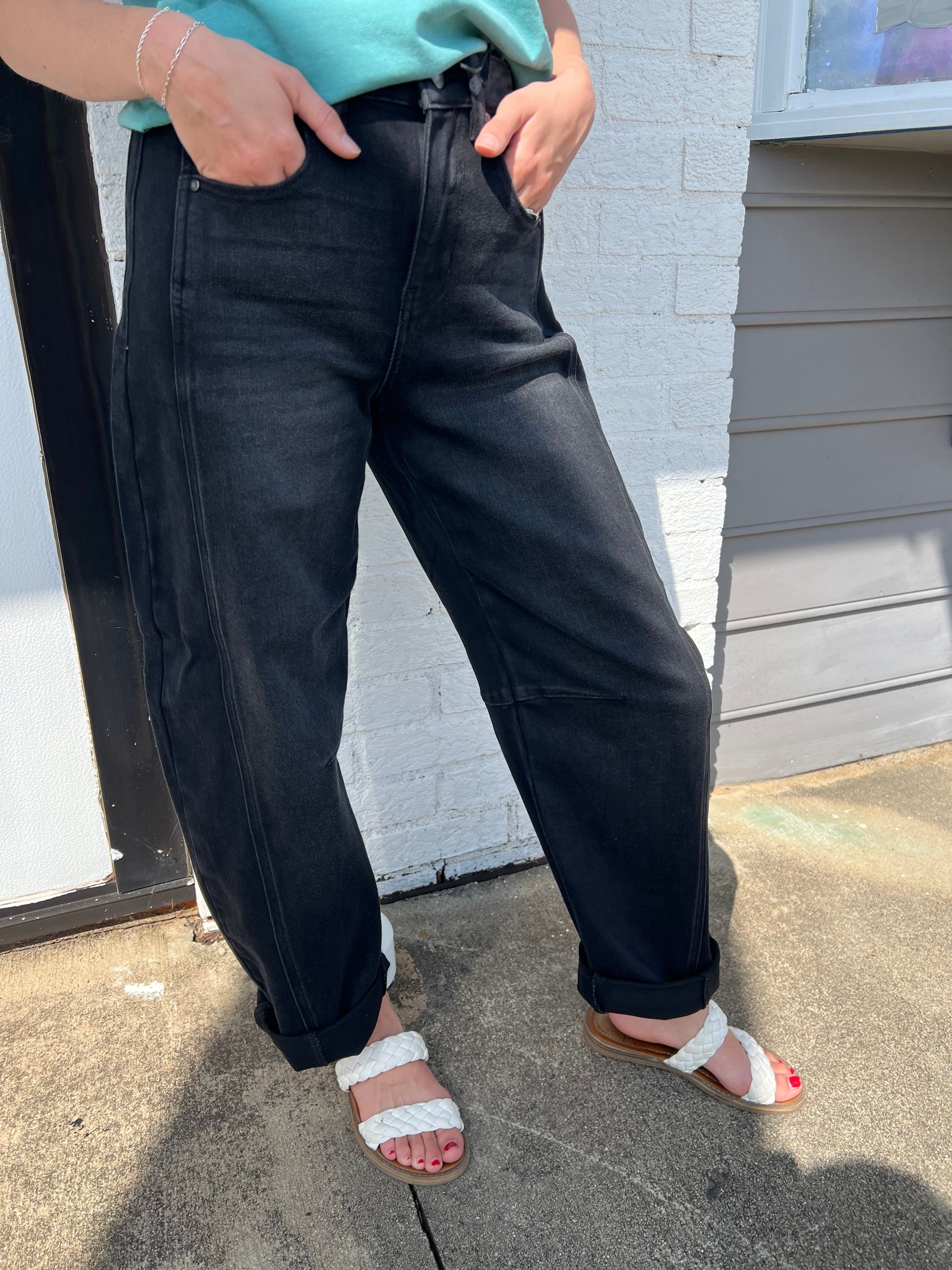 Step into style with these Black Fade Barrel Jeans, designed high-rise to hug your waist perfectly. Their cropped length and playful cuffed hems add a fun twist to your everyday look, making them ideal for showing off your favorite kicks. Whether you're dressing up or keeping it casual, these jeans blend edgy fades with a relaxed fit for effortless cool.