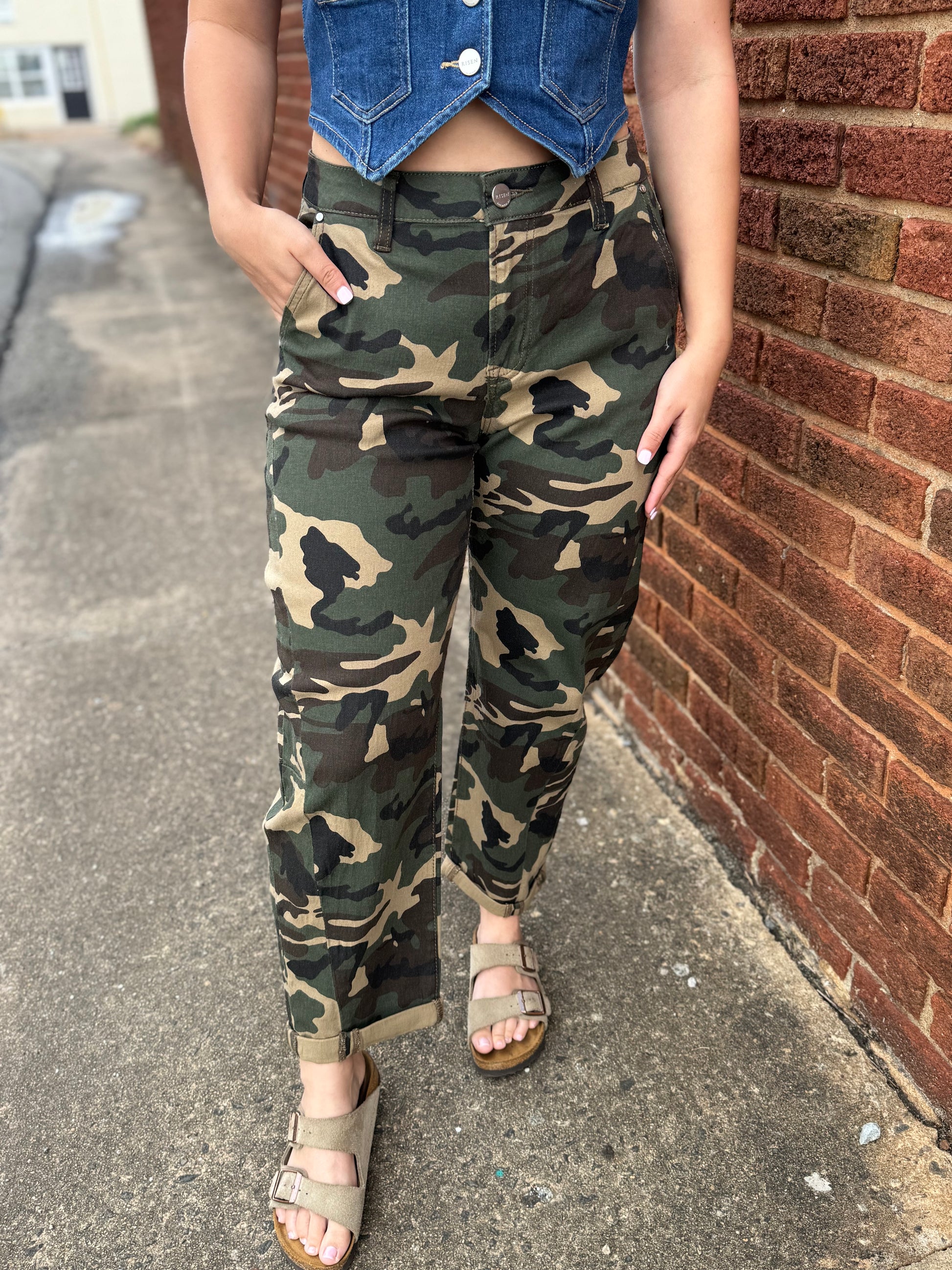 These high-rise camo barrel pants bring a fun twist to your wardrobe with their double roll-up ankle design. Perfect for adding a playful edge to casual outfits, they combine comfort and style effortlessly. Whether you're out for a stroll or meeting friends, these pants keep you looking cool and feeling confident.
