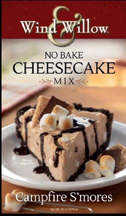 NEW from Wind & Willow, Camfire S'mores NO Bake cheese cake Mix . The most delicious way to cheesecake success! Mix it up with 8 oz of cream cheese and 16 oz of heavy whippin' cream, then spoon it into a graham cracker crust or cut the crust for a gluten-free treat. Refrigerate till ready to serve. Experience campfire-fresh flavors of chocolate and toasty marshmallows in a chilled and creamy cheesecake. Top it off with scorched marshmallows, chocolate chips, and crumbled grahams - yum!!