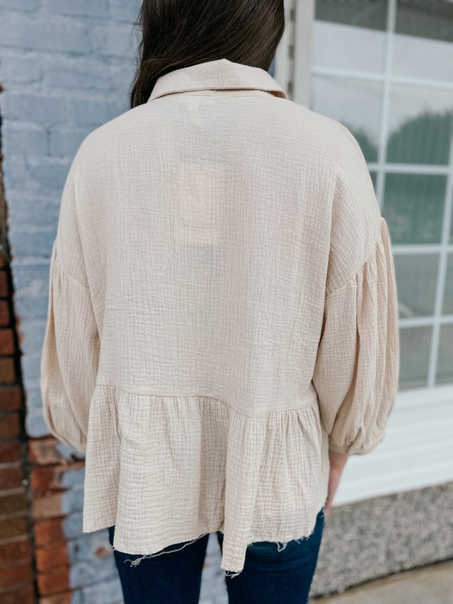 We are loving this baby doll style top! The vanilla color is a great neutral. It features a high/low look, 3/4th bubble sleeves with cuffs and a collared button neckline. The crinkle cotton fabric gives this top that extra cute detail! Pair with skinny jeans and booties and you are good to go!