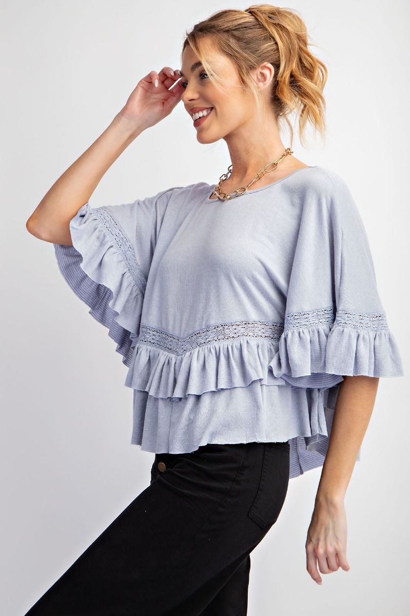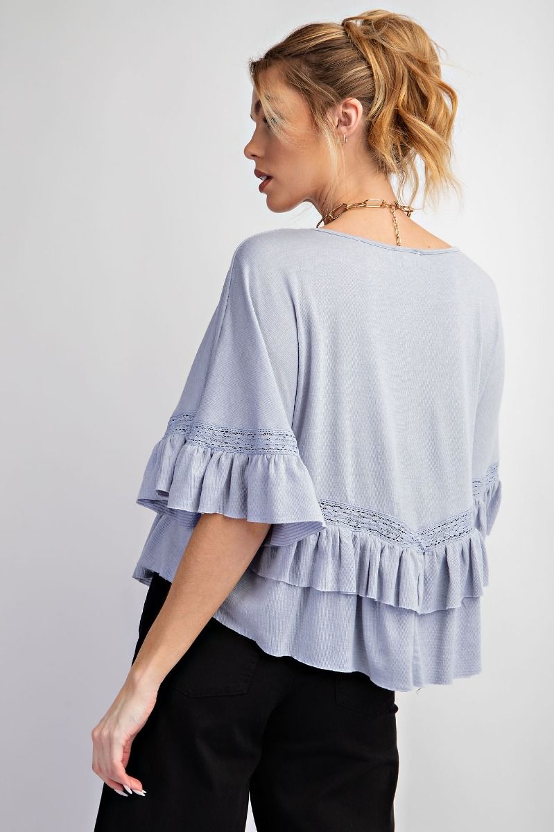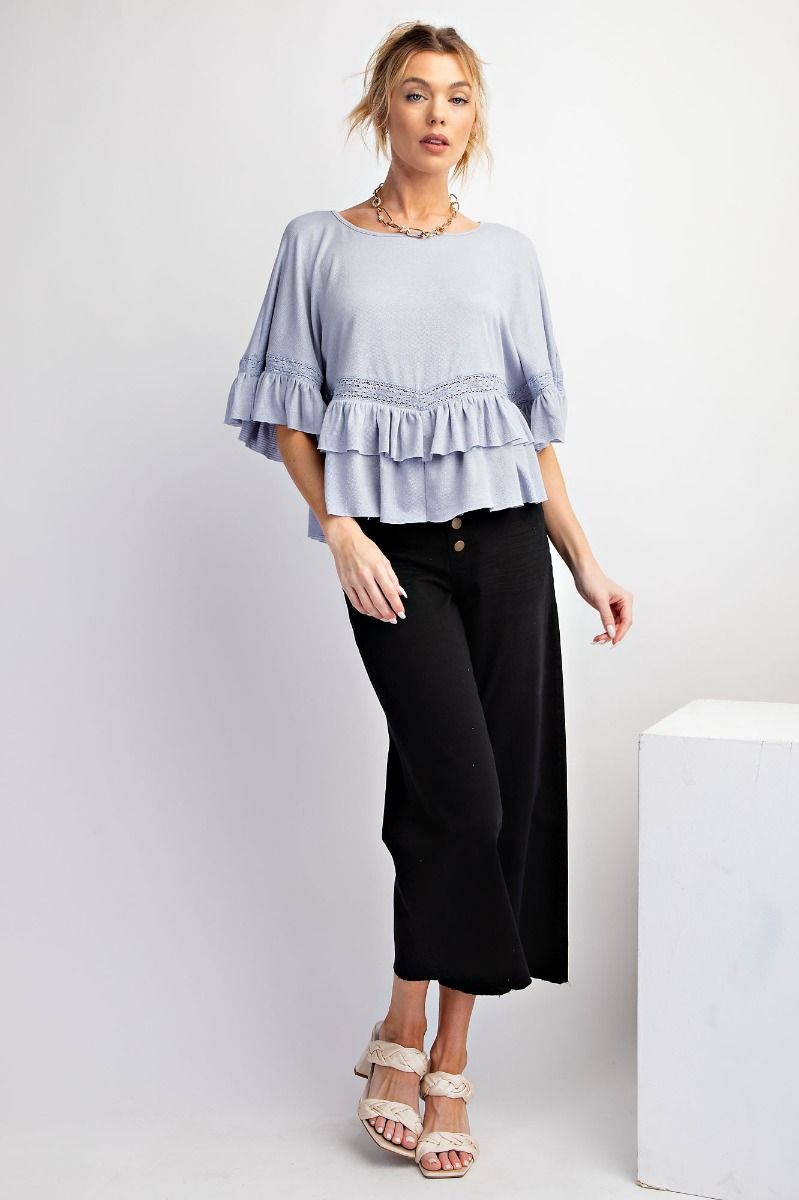 Get ready to turn heads with our Cascade Charm Ruffle Top! This fun knit top features a boat neckline and a double-ruffled bottom for a fun and playful look. With a relaxed and loose fit, this top is perfect for any occasion. Made with crinkle rayon fabrication, it's not only stylish but also comfortable and easy to care for. Add this cropped top to your wardrobe for a touch of charm and style.
