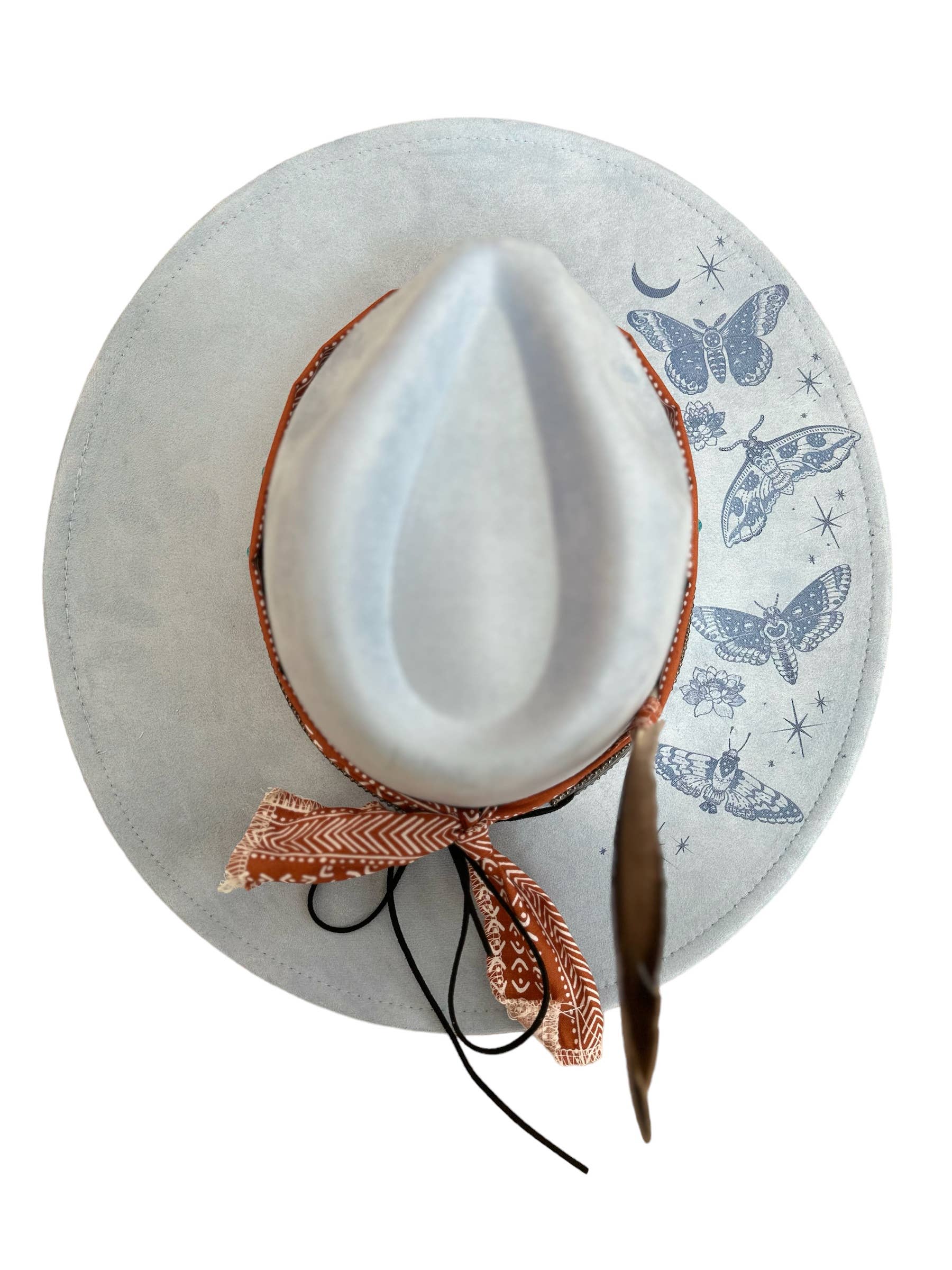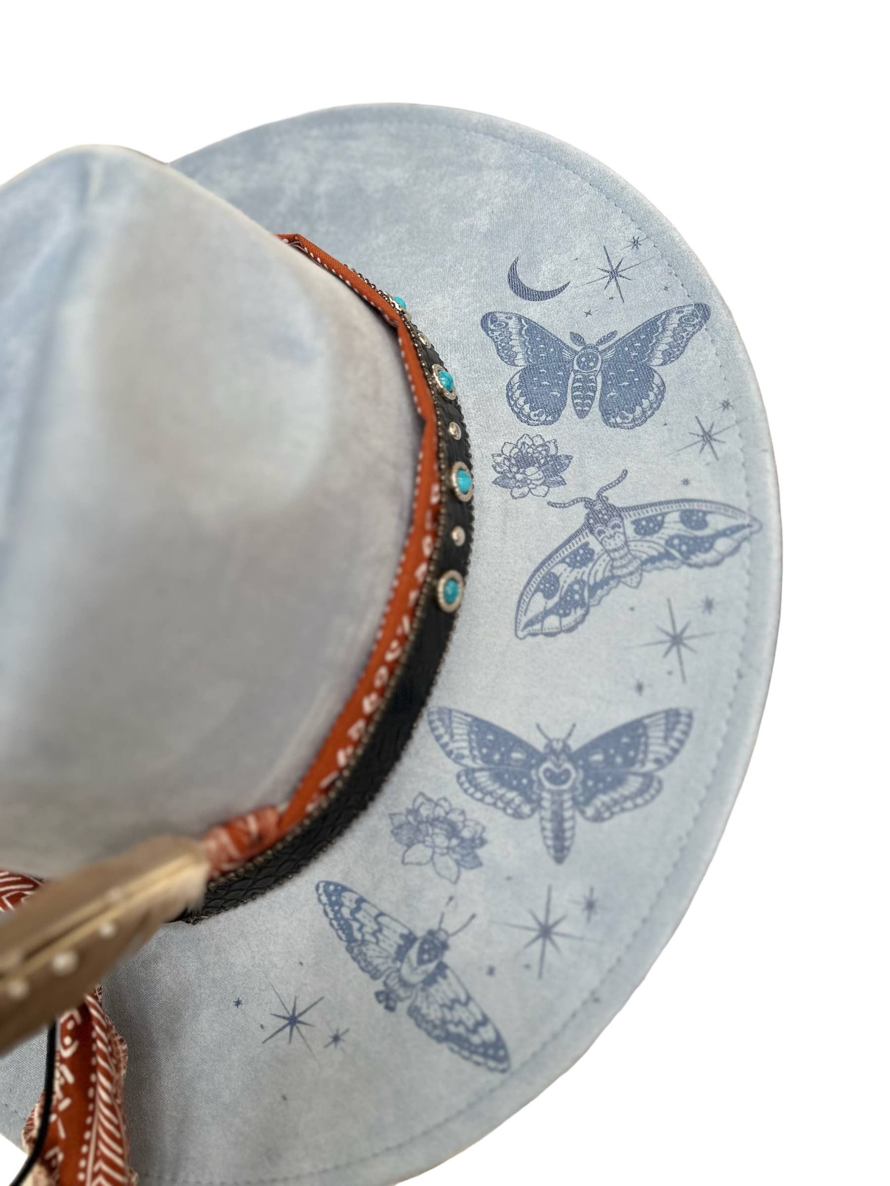 Burned onto our incredible light weight and comfortable vegan suede rancher hat. This is the color “sky”