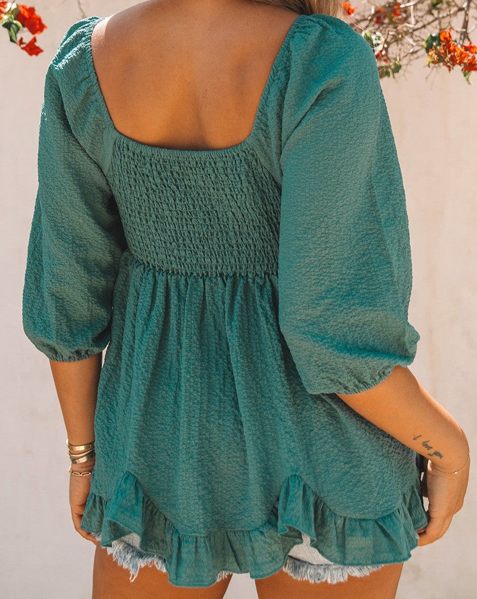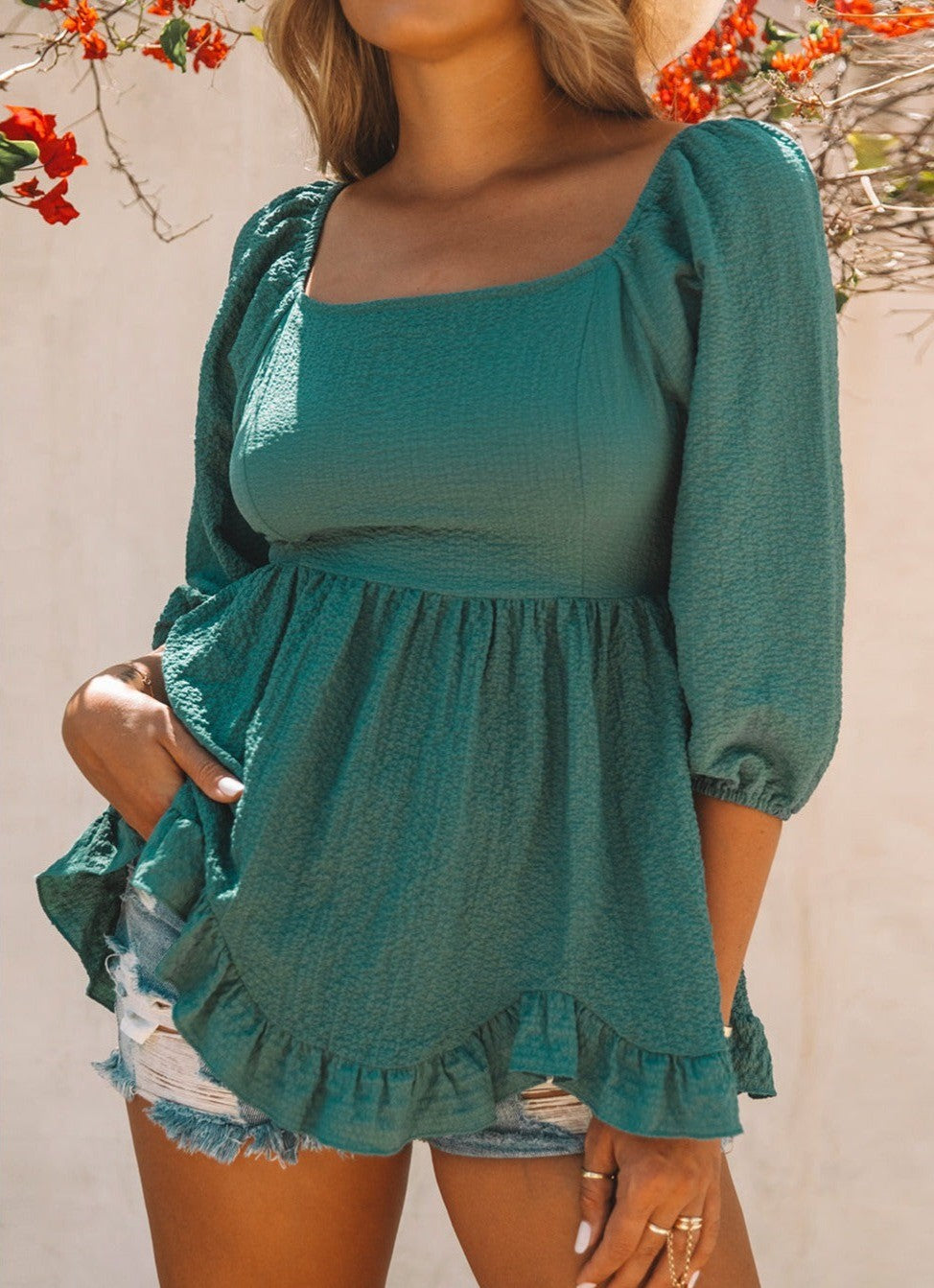 Live life in technicolor with our Cherish Every Moment Top! This textured woven top comes alive with a fun and flirty square neckline and off-the-shoulder 3/4 length raglan sleeve. It finishes off with shirring details, a ruffled hem, and an empire waistline that hugs you in all the right places. So slip it on and let the fun begin!