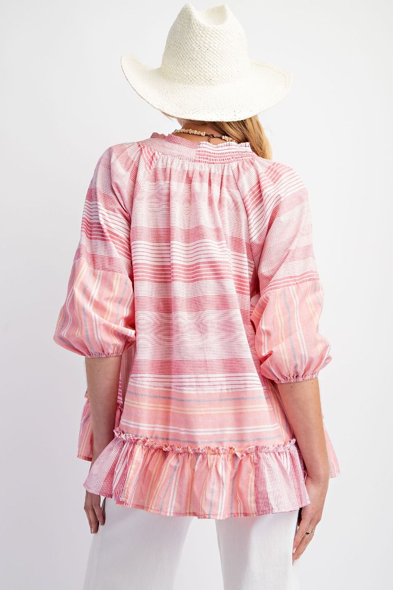 Add some sweet style to your wardrobe with our Cotton Candy Striped Ruffle Top in Pink! Made from 100% cotton, this top features a pink mixed stripe design with playful ruffles. Perfect for adding a pop of fun to any outfit. So cute, you'll want to eat it up!