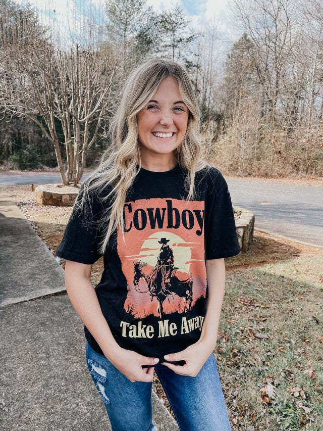 Cowboy Take Me Away Black Graphic Tee. It's loose in all the right places. An open neckline, and slightly dropped sleeves. Order a size up to wear as a shirt dress. Fun, soft, and an absolute must for anyone's closet.