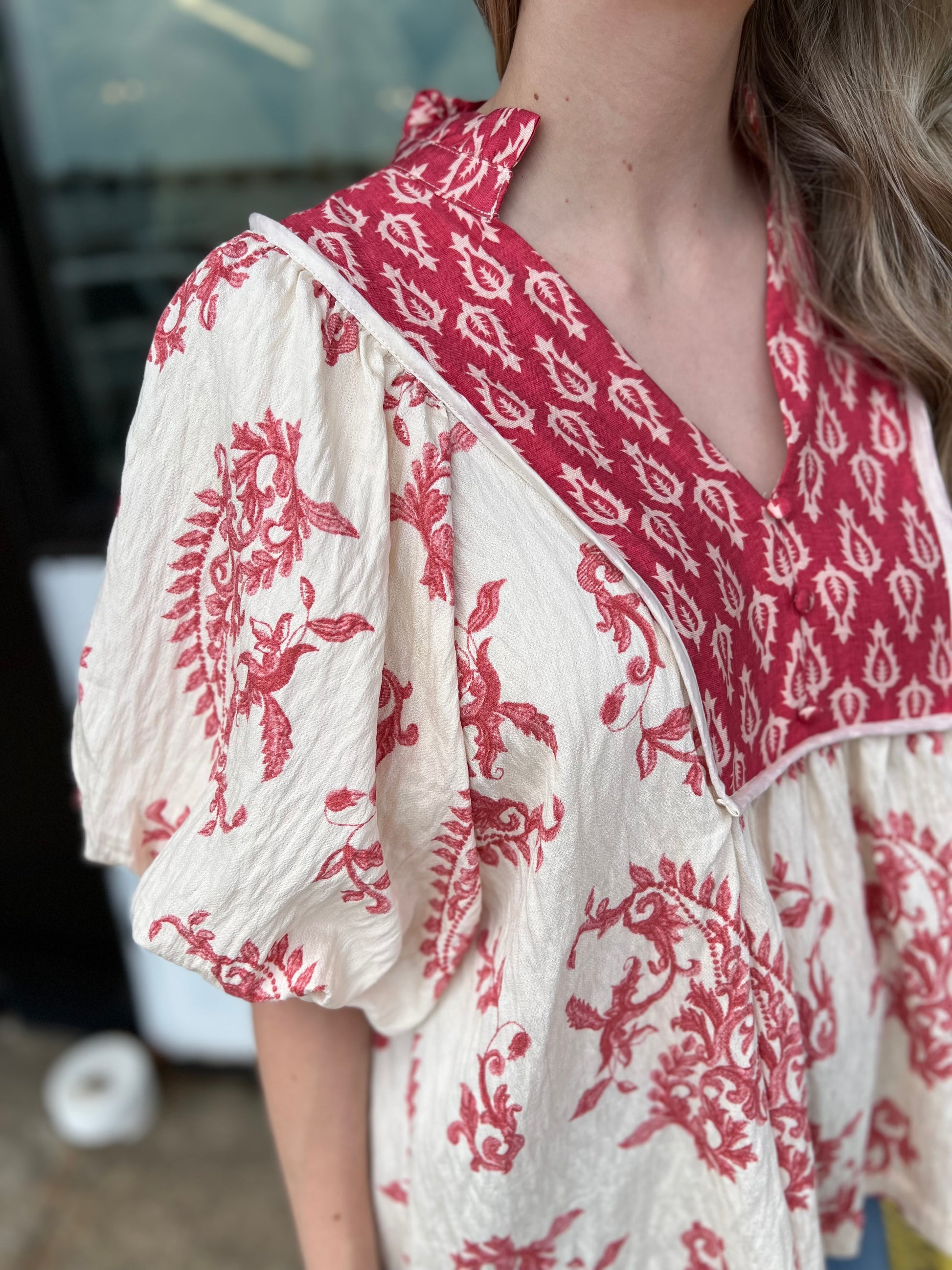 Unleash your inner free spirit with our Crimson Bloom Blouse! This boho-inspired top features whimsical puff sleeves and eye-catching prints that add a touch of fun to any outfit. Perfect for festival season or casual coffee dates, this blouse brings playful vibes to your wardrobe while keeping you comfortably stylish all day long.