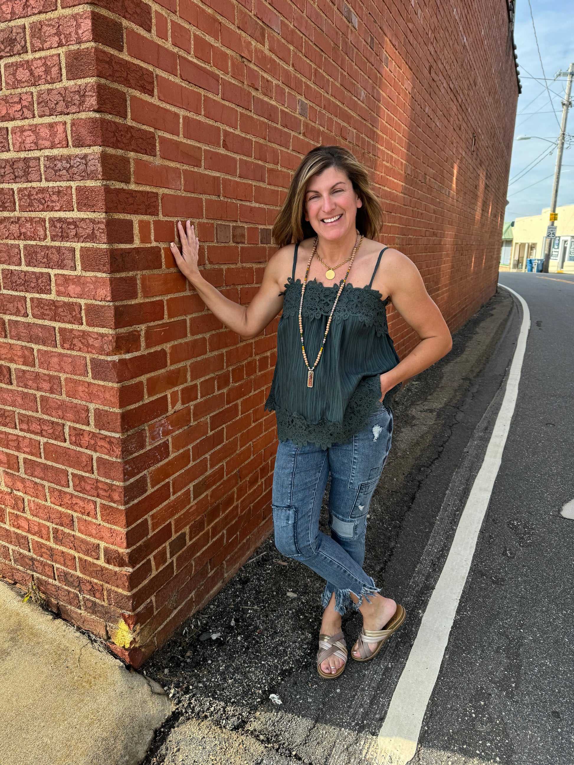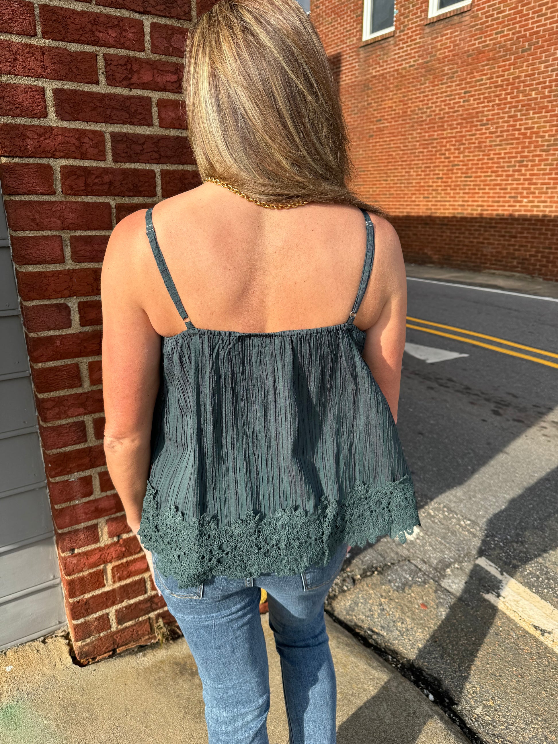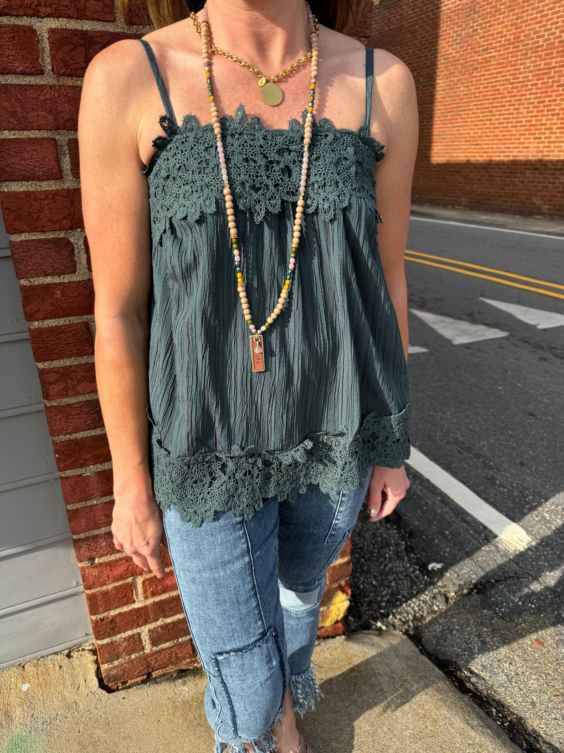 This adorable cami top in ash green features a square neckline and crochet lace detailing. With adjustable spaghetti straps and a slouchy, loose fit, it's perfect for any occasion. Made from crinkled challis for a comfortable and stylish look.