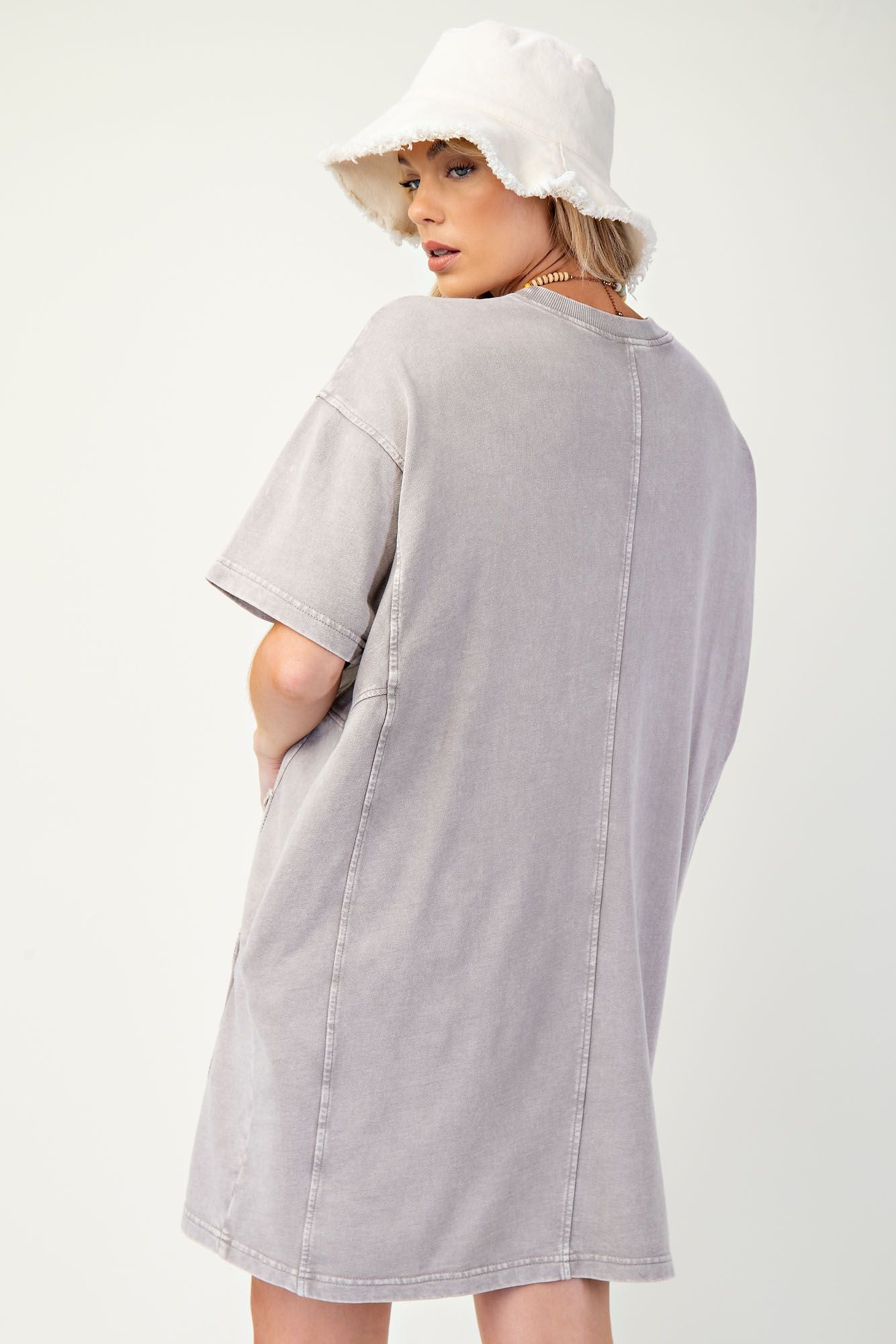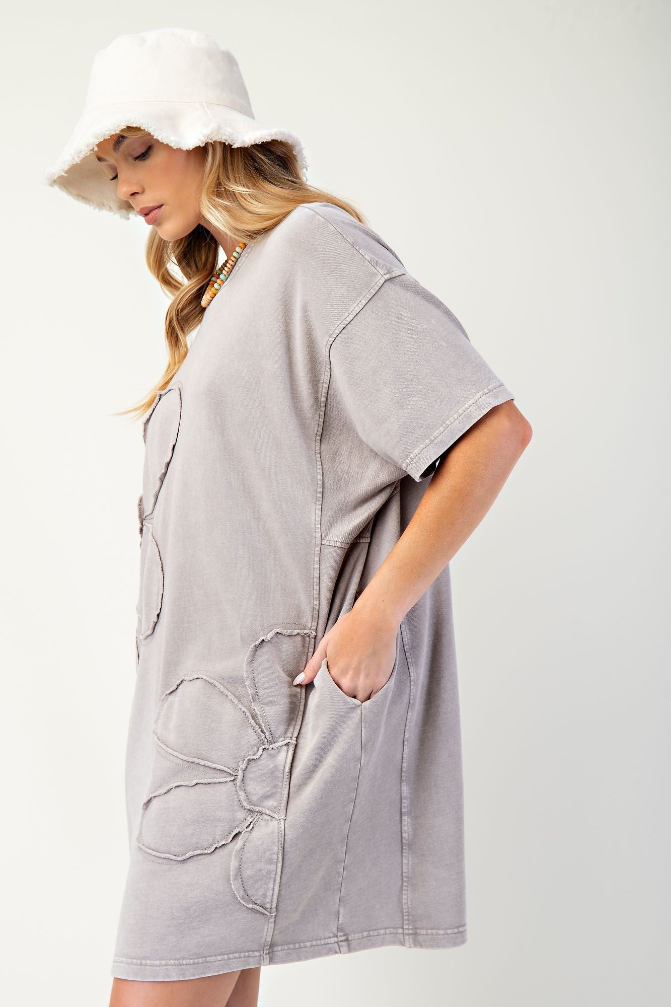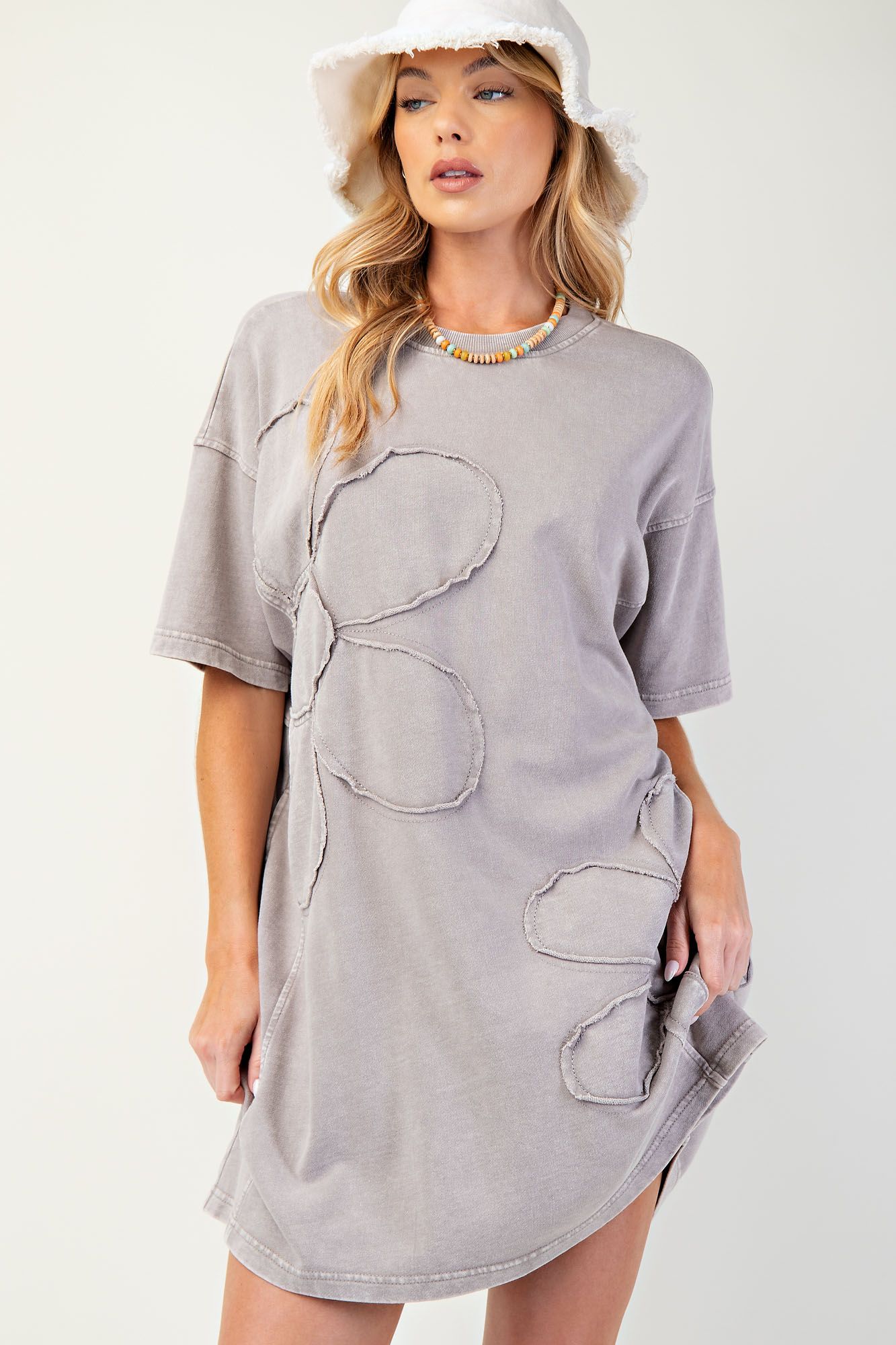 Embrace the carefree vibes with our Daisy Patch T-Shirt Dress! Made with lightweight terry knit fabric and featuring dropped shoulders and side pockets, this relaxed and boxy dress is perfect for any casual outing. The raw cut and raised daisy patches add a unique touch, making it a must-have for your wardrobe.