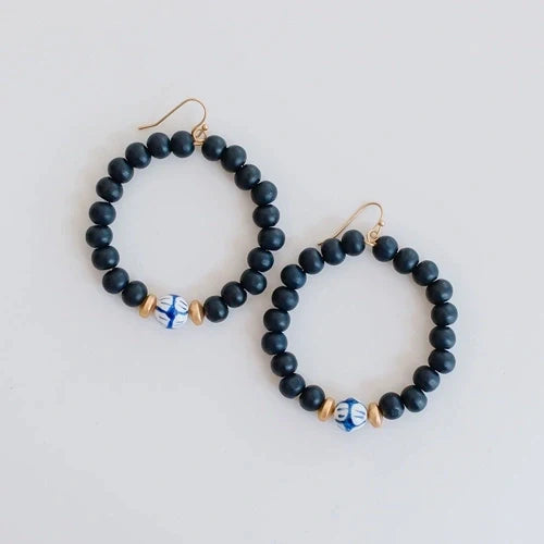 navy Seed bead hoop earrings with chinoiserie bead accent, 2.5”, surgical steel posts