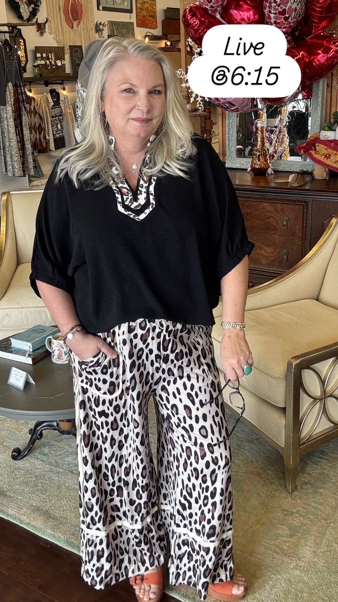Slip into effortless style with this Edge of Leopard Blouse, where relaxed dolman half sleeves meet modern flair. The flattering V neckline creates a feminine silhouette, while bold leopard patchwork trim along the edges brings just the right amount of playful attitude.