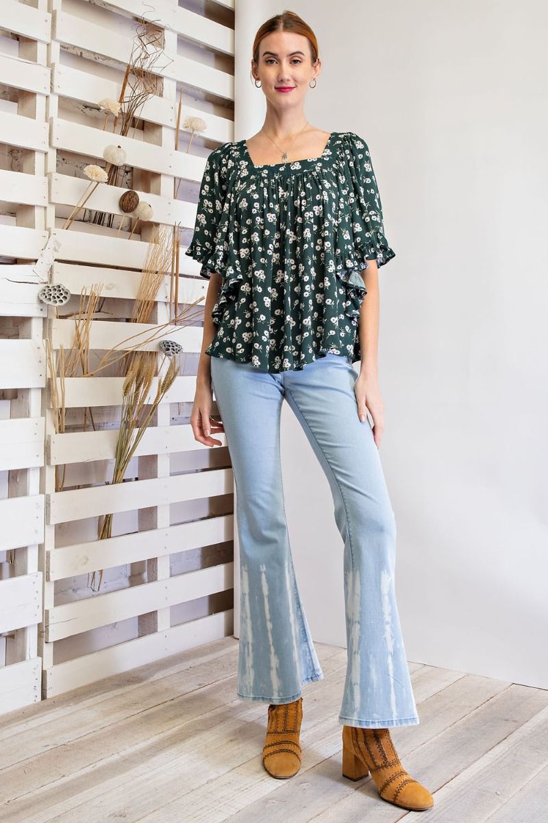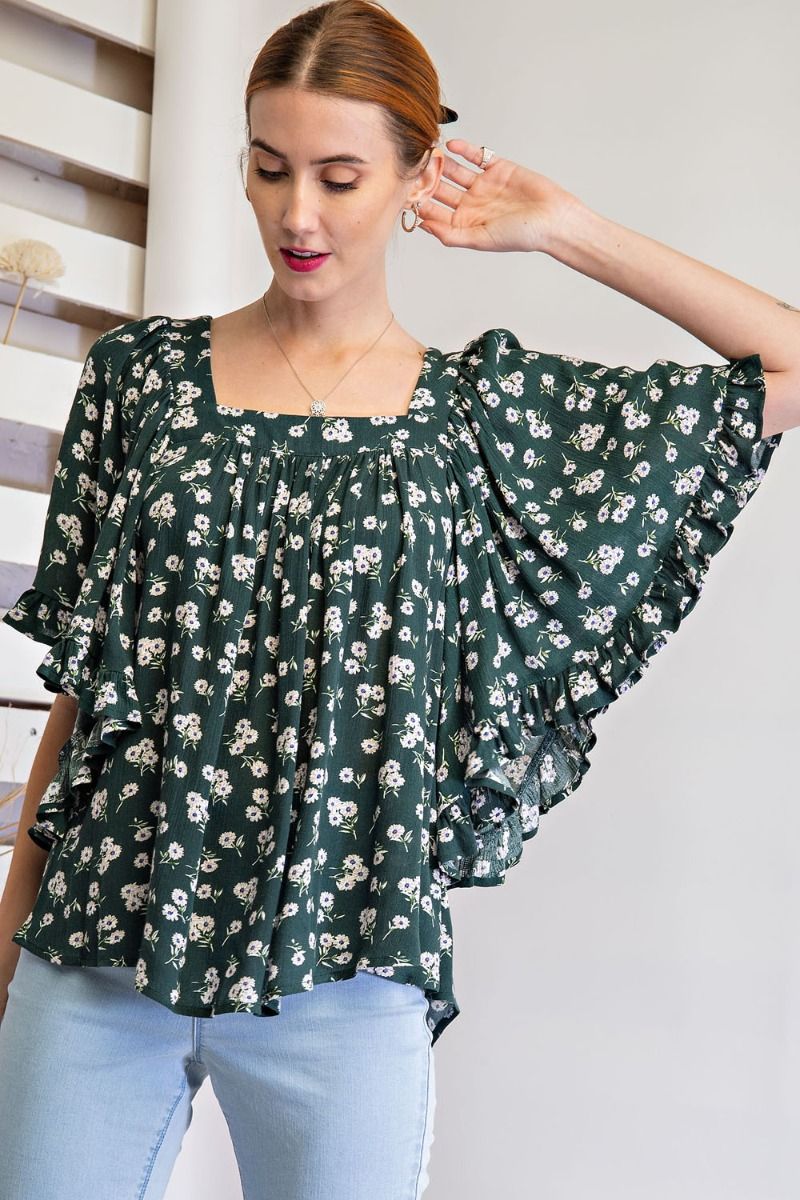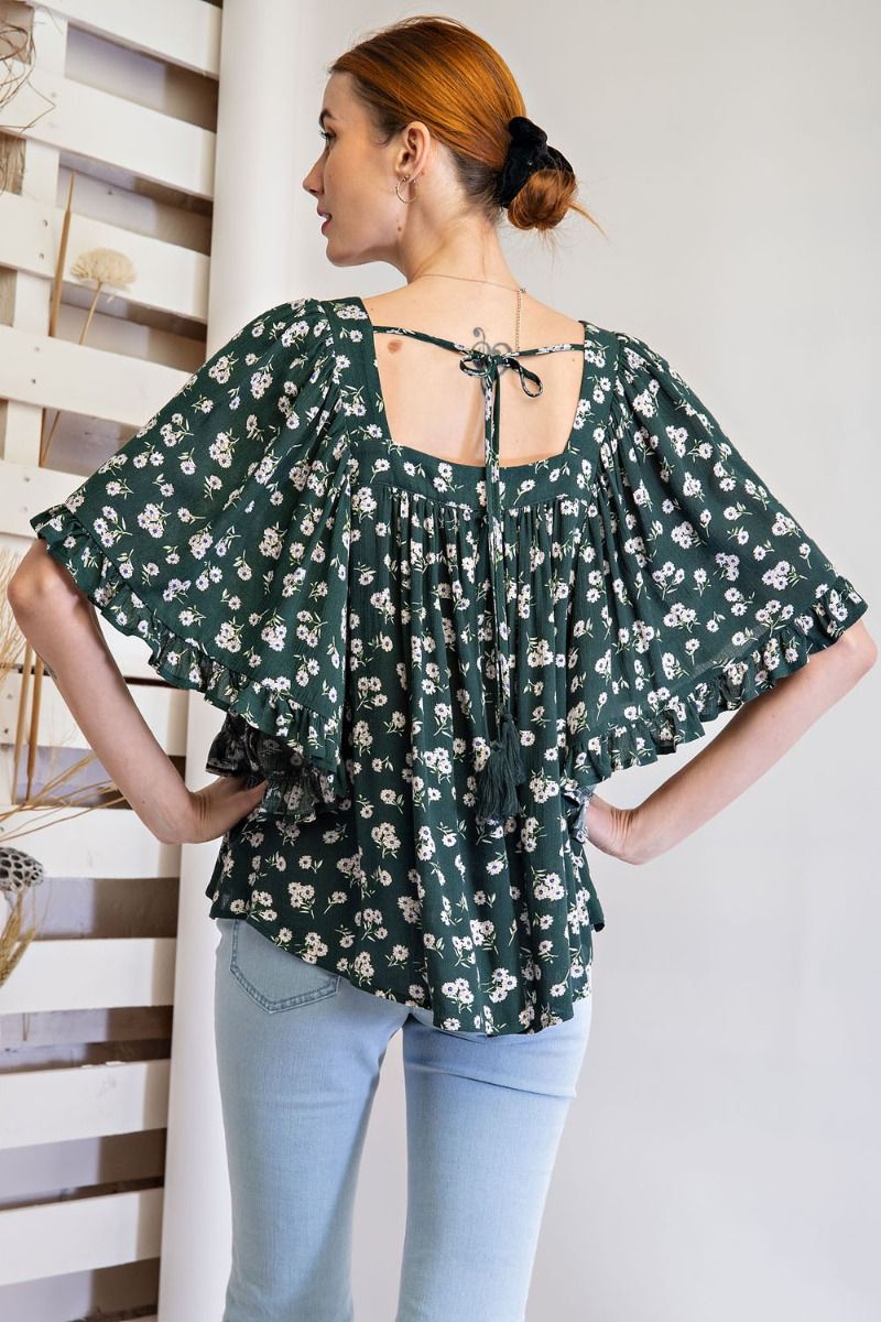 This Emerald Butterfly Floral Top features unique butterfly sleeves, a square neckline, and ruffled cuffs for a playful and relaxed look. Made with a lightweight woven fabric and pleated throughout, this top offers a loose and comfortable fit. Complete the look with a tie closure back for added charm.