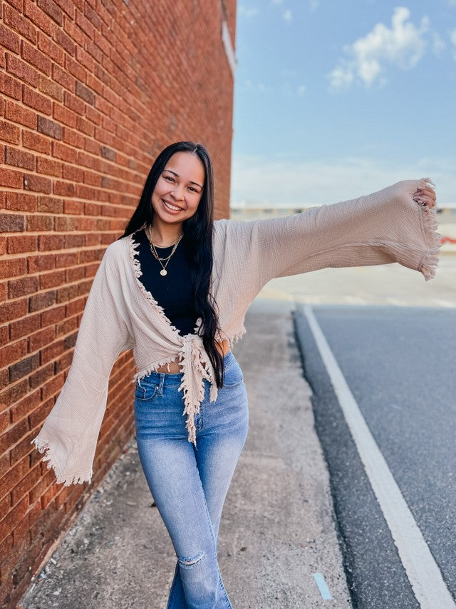 A flirty cropped cardigan top is just what your closet is missing - we love the lightweight material and the frayed hem detail on a bell sleeve. In a light taupe color, this top features a cropped fit, vintage look, and a adjustable wrap around tie in the front.