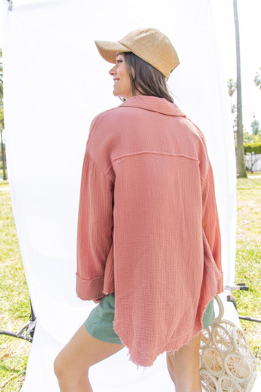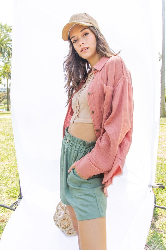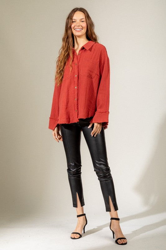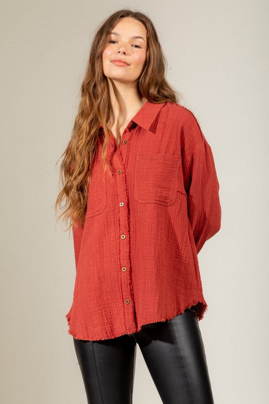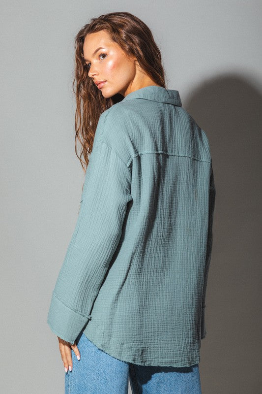 Stay cool and look cool with the Feel the Breeze Button Up! This lightweight top is available in a range of soft and stylish colors, so you can find the perfect hue to express your unique style. Get breezy and be trend-savvy without breaking a sweat!
