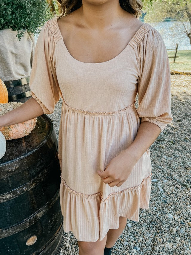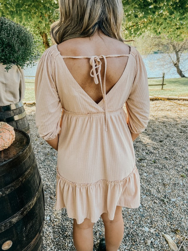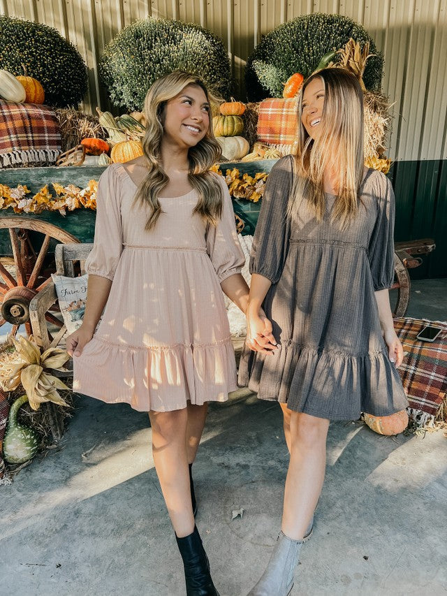 We are feeling thankful for some cooler fall days so that we can wear this cute little dress! It is a babydoll style with 3/4th sleeves and an adorable tie in the back. Knit material and fully lined. Has pockets!
