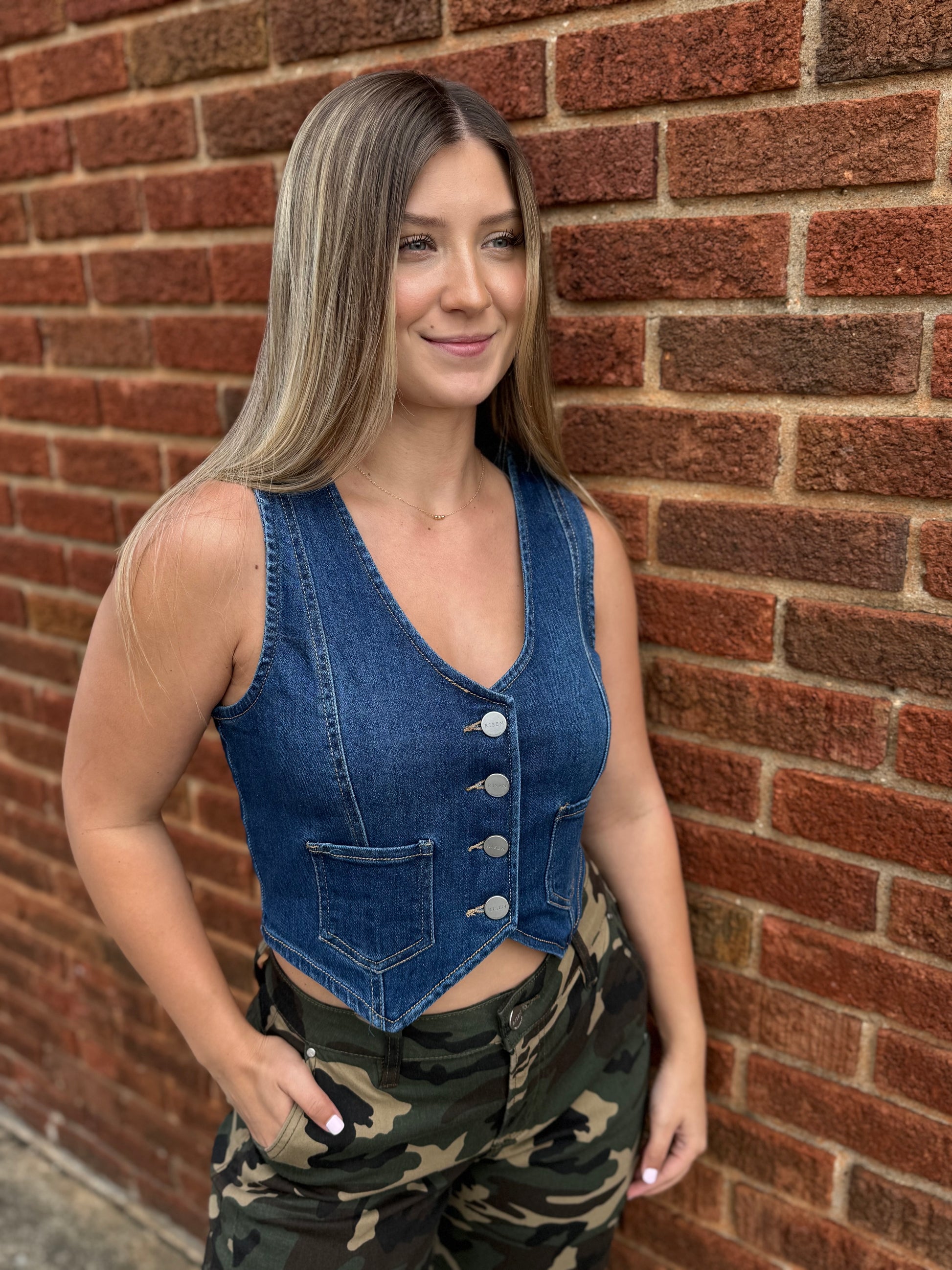 This High Noon Crop Vest in a dark wash denim is your new go-to for adding a fun, edgy twist to any outfit. Its cropped cut keeps things flirty and fresh, perfect for layering over tees or dresses. Lightweight yet durable, it’s ready to keep up with your playful style all day long.