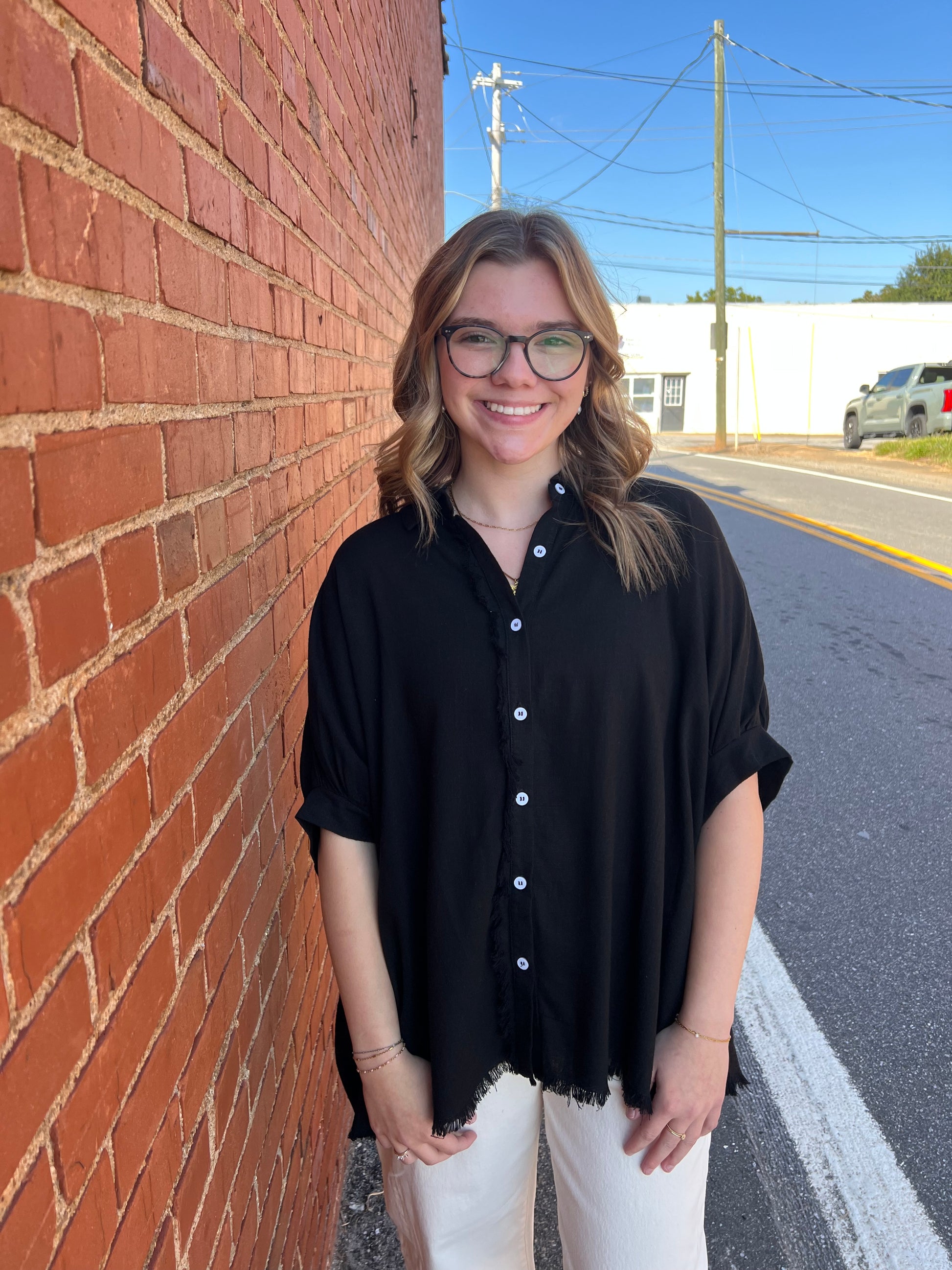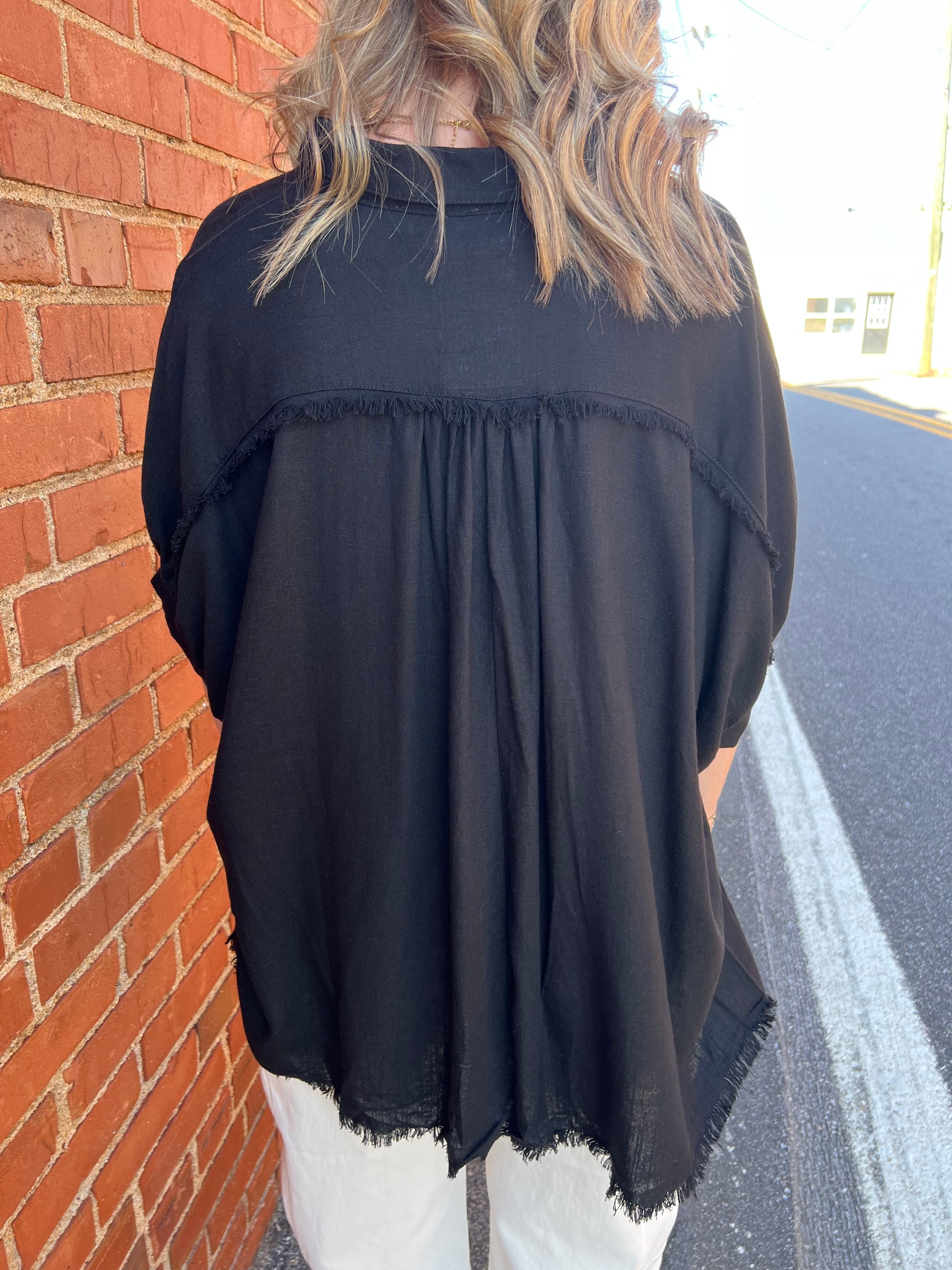 Meet your new favorite go-to: the On the Fray Top in Black. This linen button-down shirt features delightfully frayed edges that add a fun, carefree twist to a classic silhouette. Lightweight and breathable,