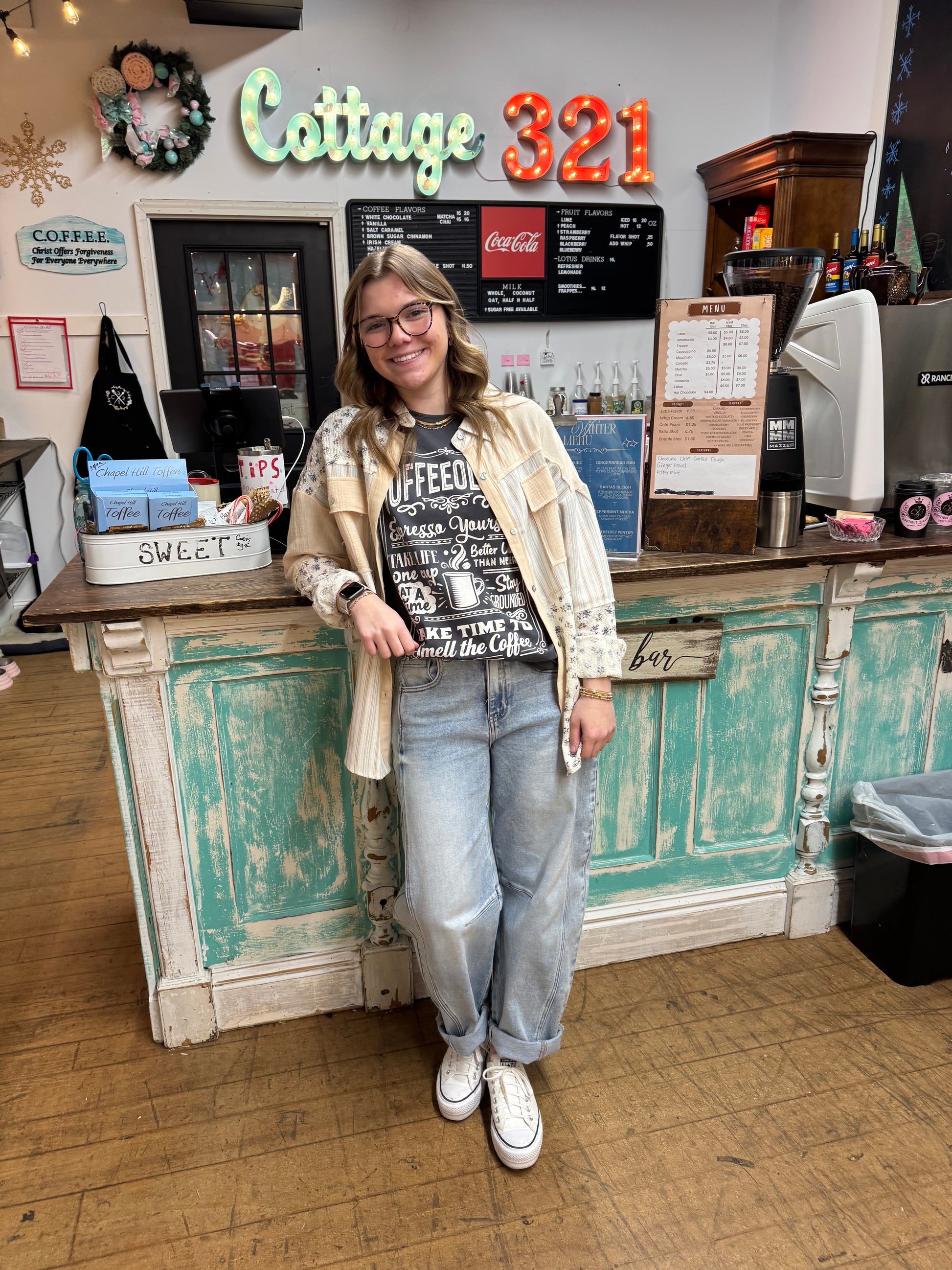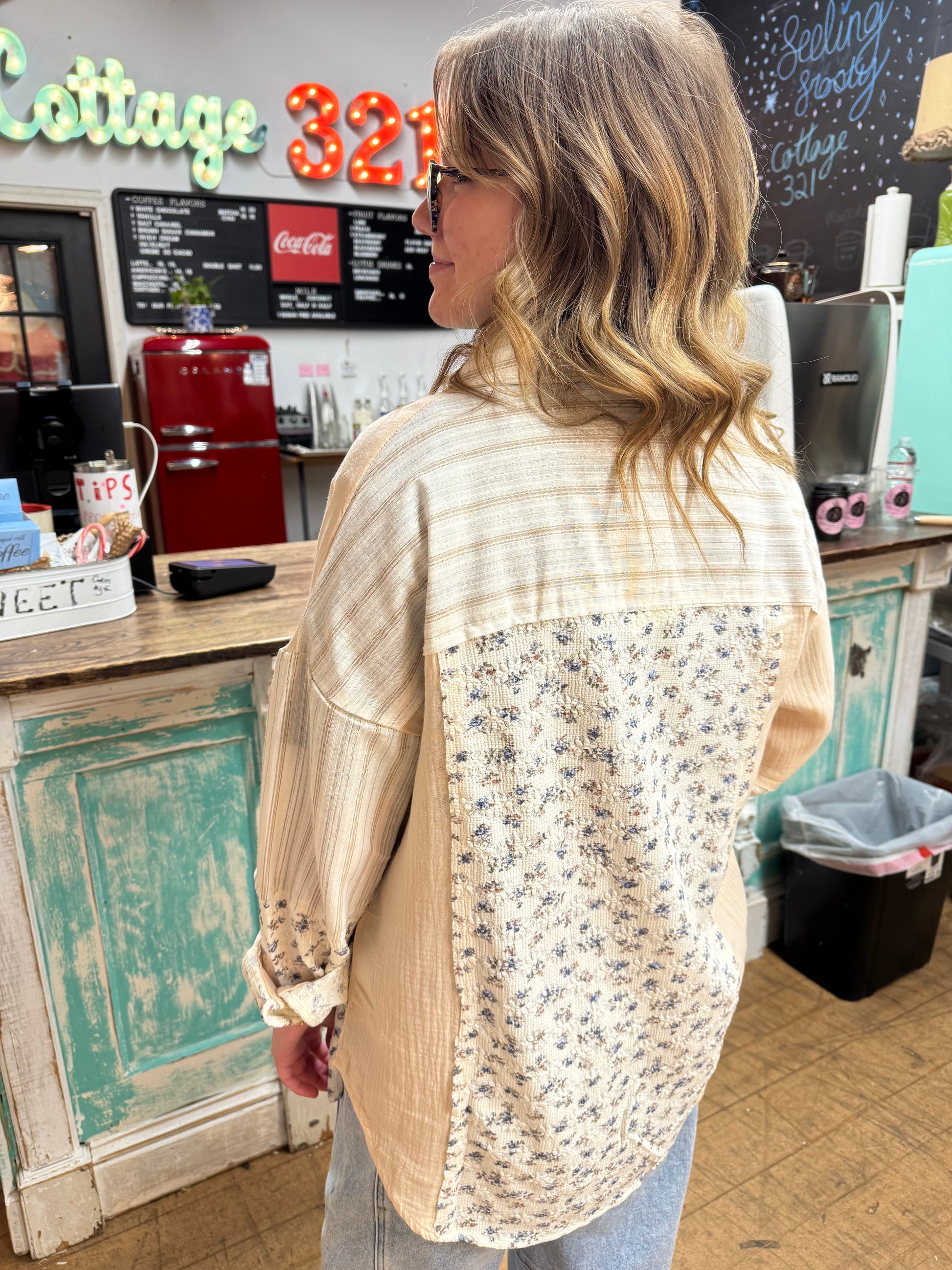 **PLUS SIZE Search for NT12471X** - Floral & Stripe Oversized Shacket Jacket - Patch Pockets - Drop Shoulder - Long Sleeve - Round Hem (Model height: 5'9", wearing a Small, 2-2-2 Size Ratio, NEW IN)