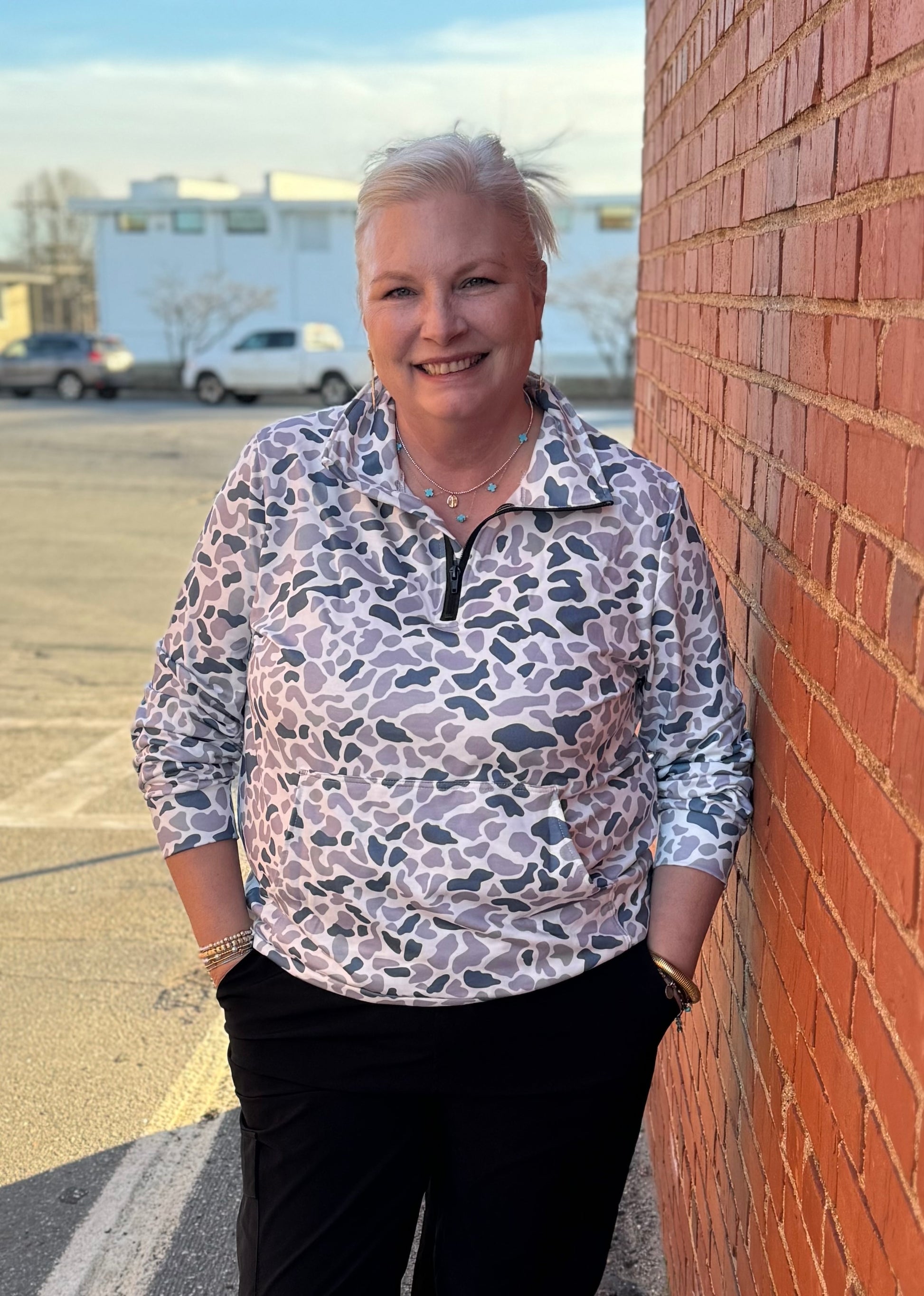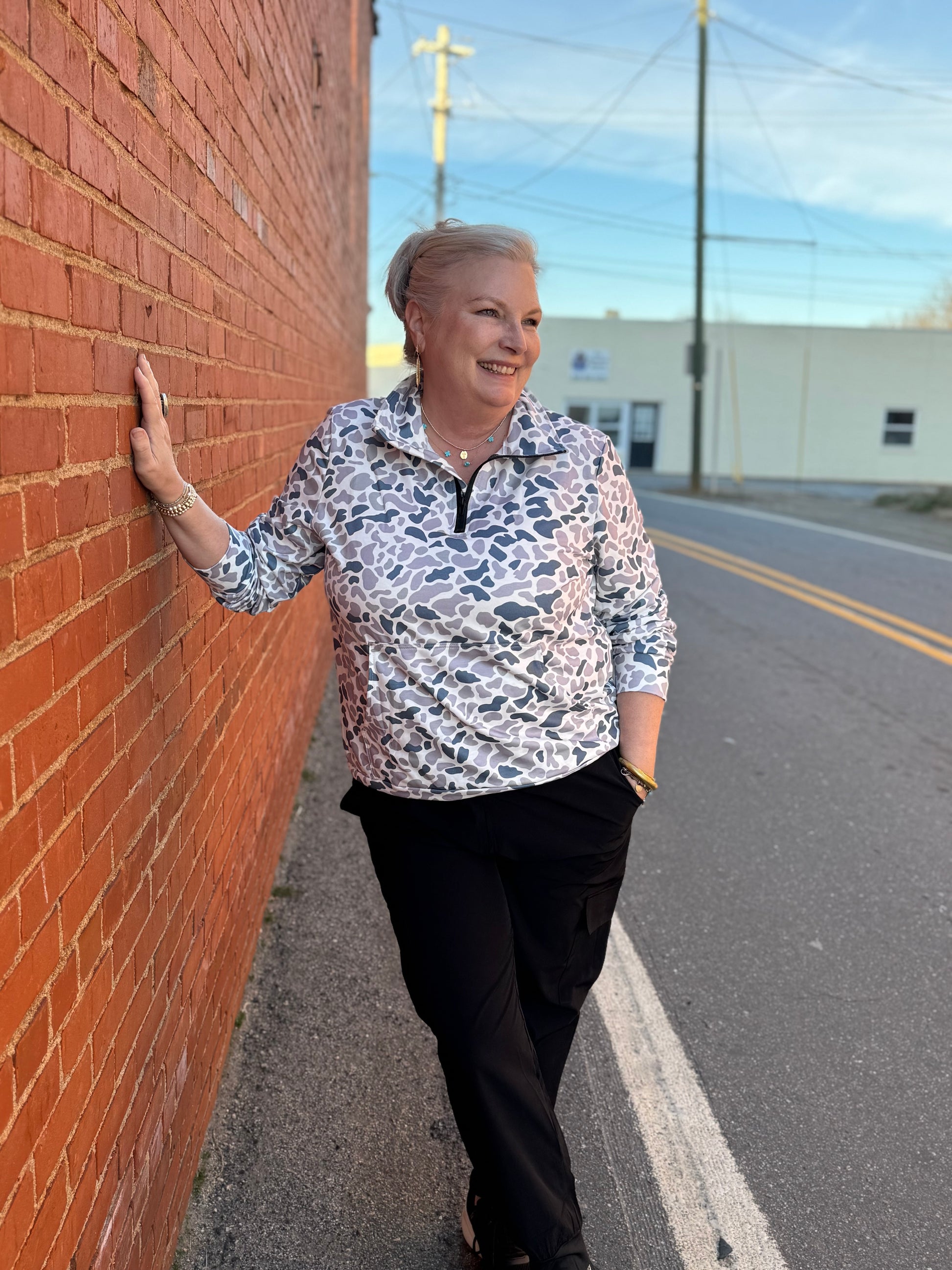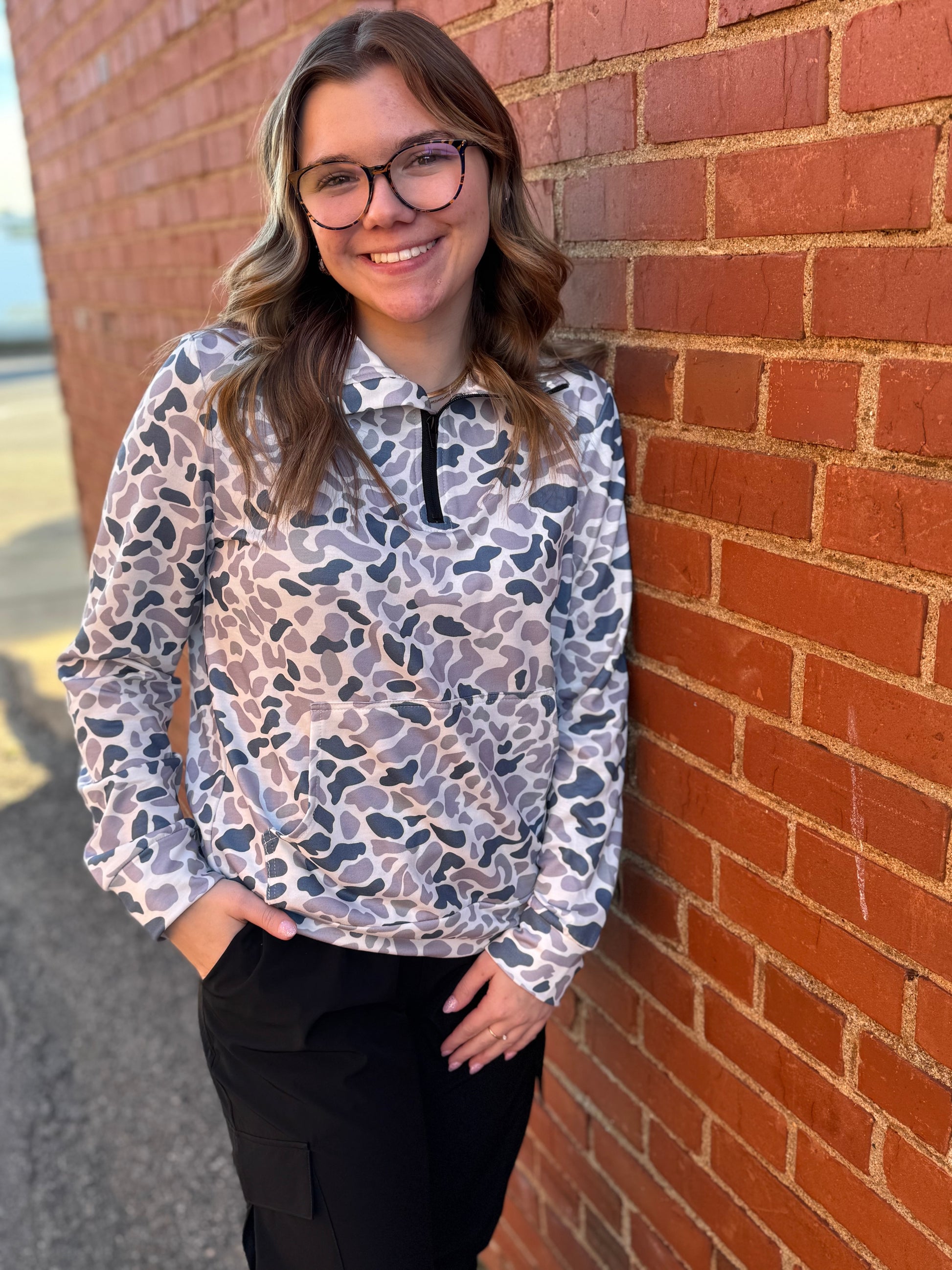 Rock the streets in effortless style with the Off-Duty Camo Zip. This chic camo sweatshirt blends casual comfort with streetwear edge—perfect for those days when you want to look put-together without trying too hard.