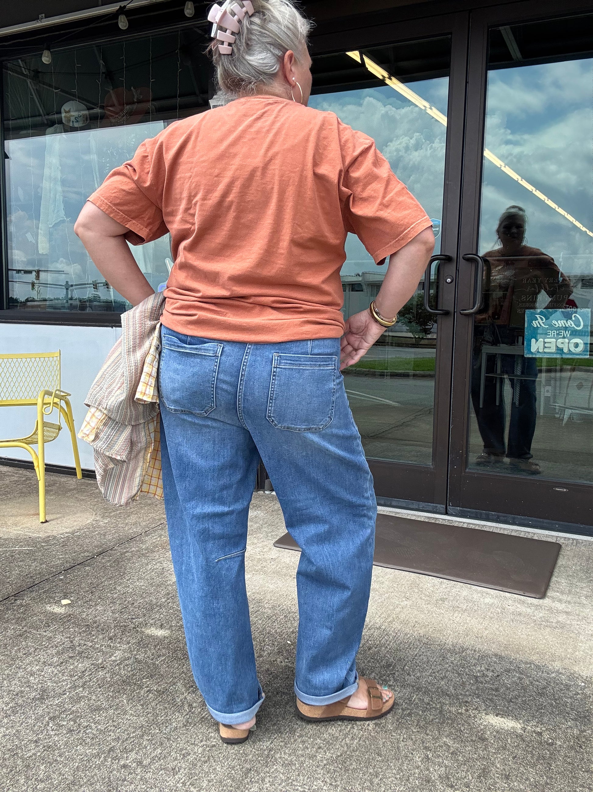 Step into comfort and style with our Patch Pocket Barrel Jeans in a cool medium wash. Featuring a relaxed fit and trendy barrel silhouette, these jeans bring a laid-back vibe perfect for everyday adventures. The roomy patch pockets add a fun, functional touch while mid-rise design keeps things just right. Whether you're hanging out or heading out, these jeans have got your casual look covered with a playful twist.