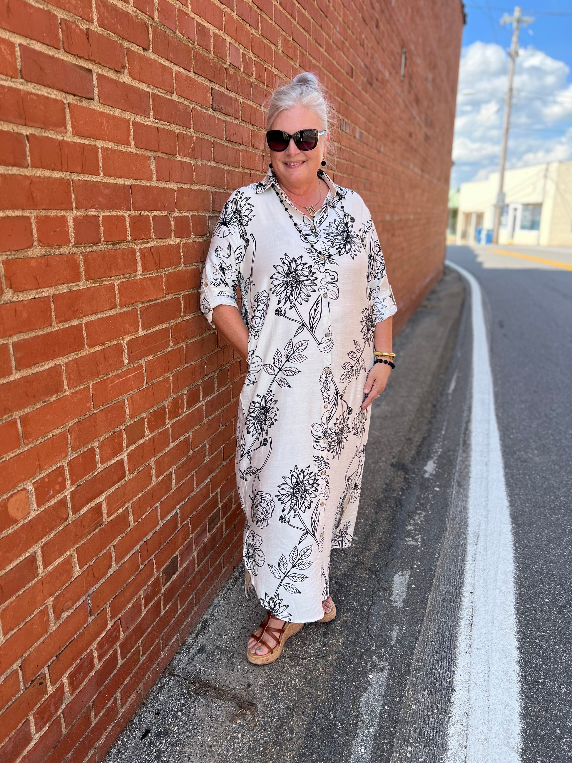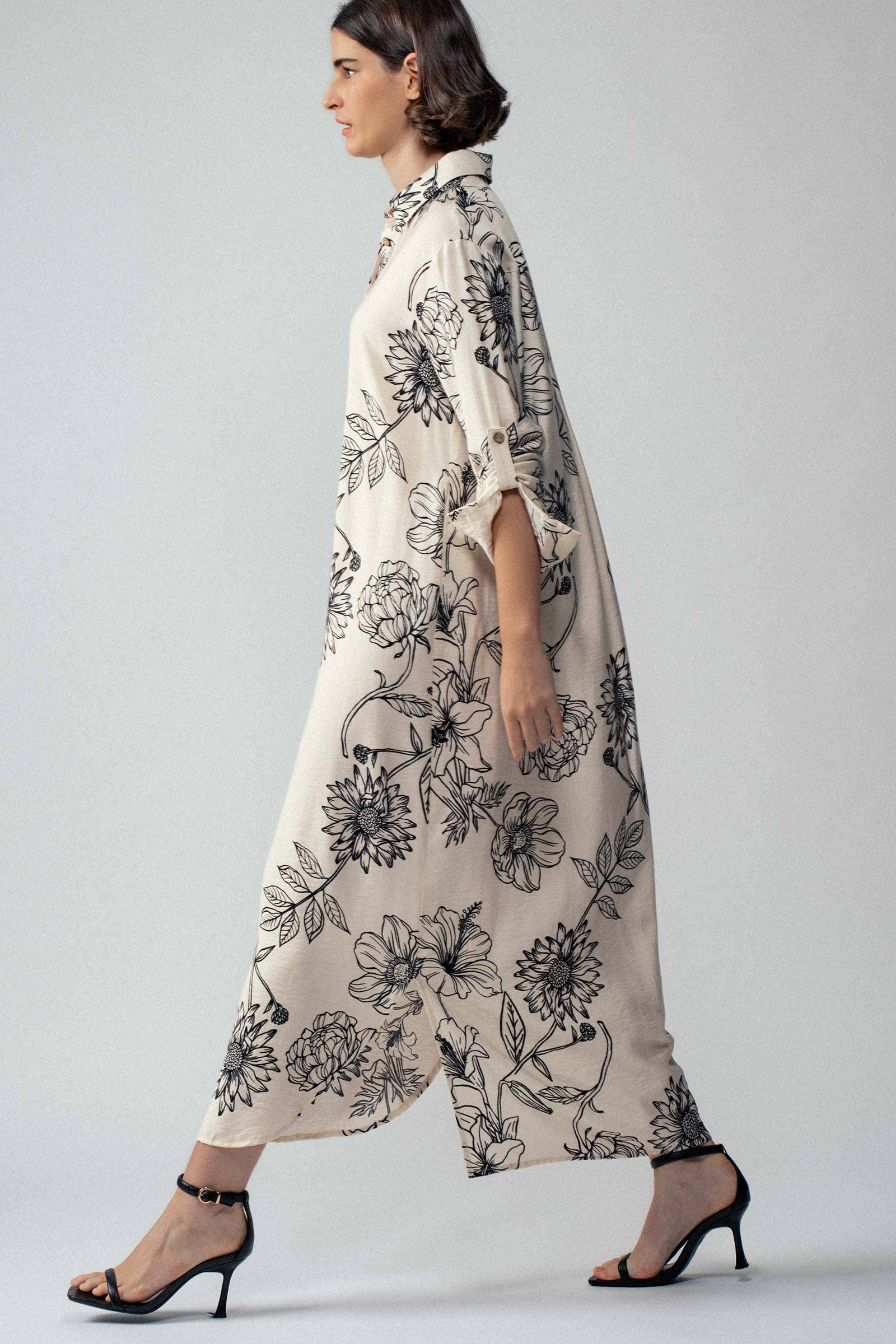 This breezy summer dress features a classic collared neckline, button-down front, and side slits for easy movement. Crafted from a lightweight rayon-nylon blend, it offers a loose, relaxed fit with rolled sleeves and an oversized, flowy silhouette.