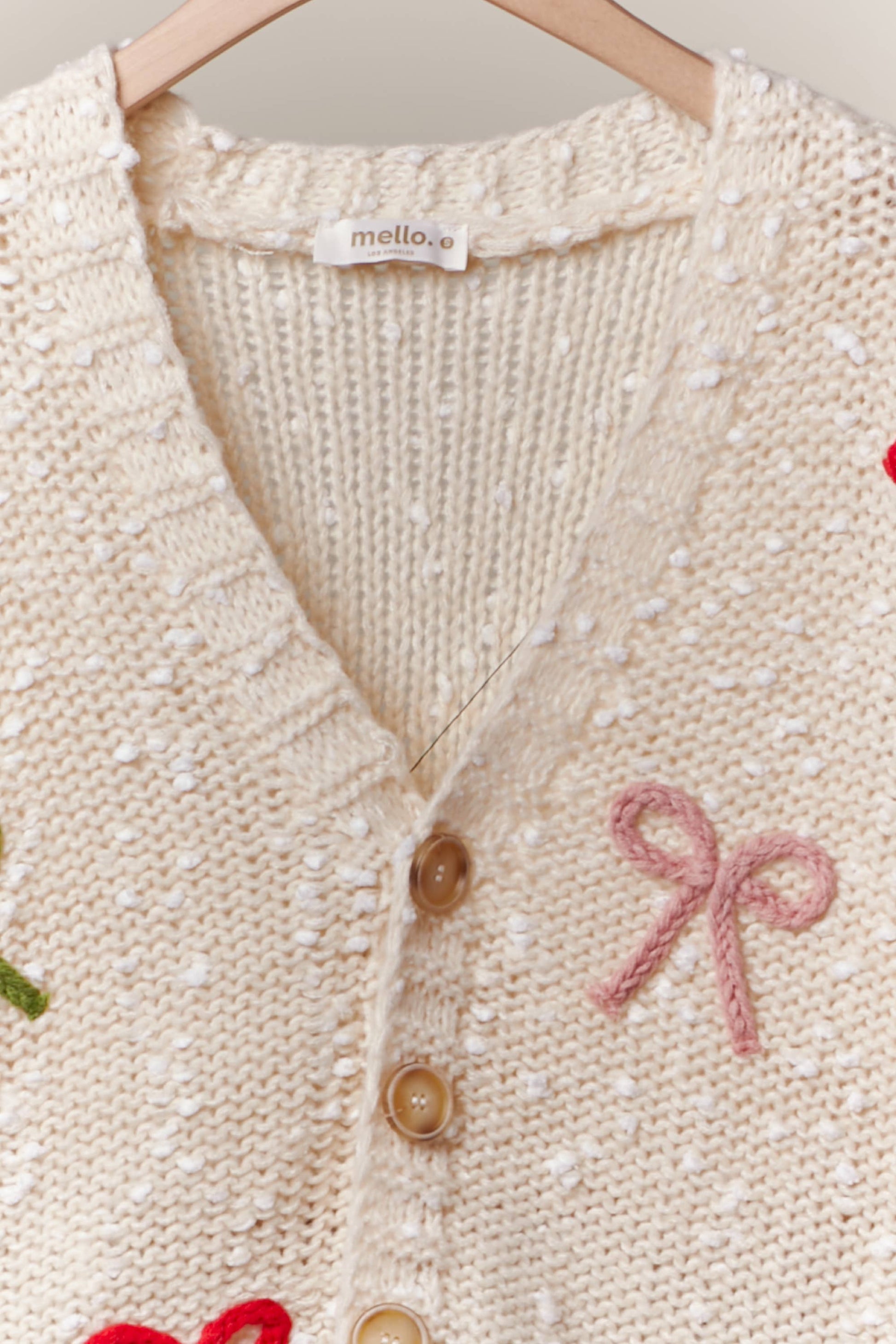Introducing our **Elsie Ribbon Cardigan** - a feminine and stylish addition to your wardrobe! The charming ribbon patches add a unique touch to this button-down cardigan. Step up your style game with this quirky and playful piece!