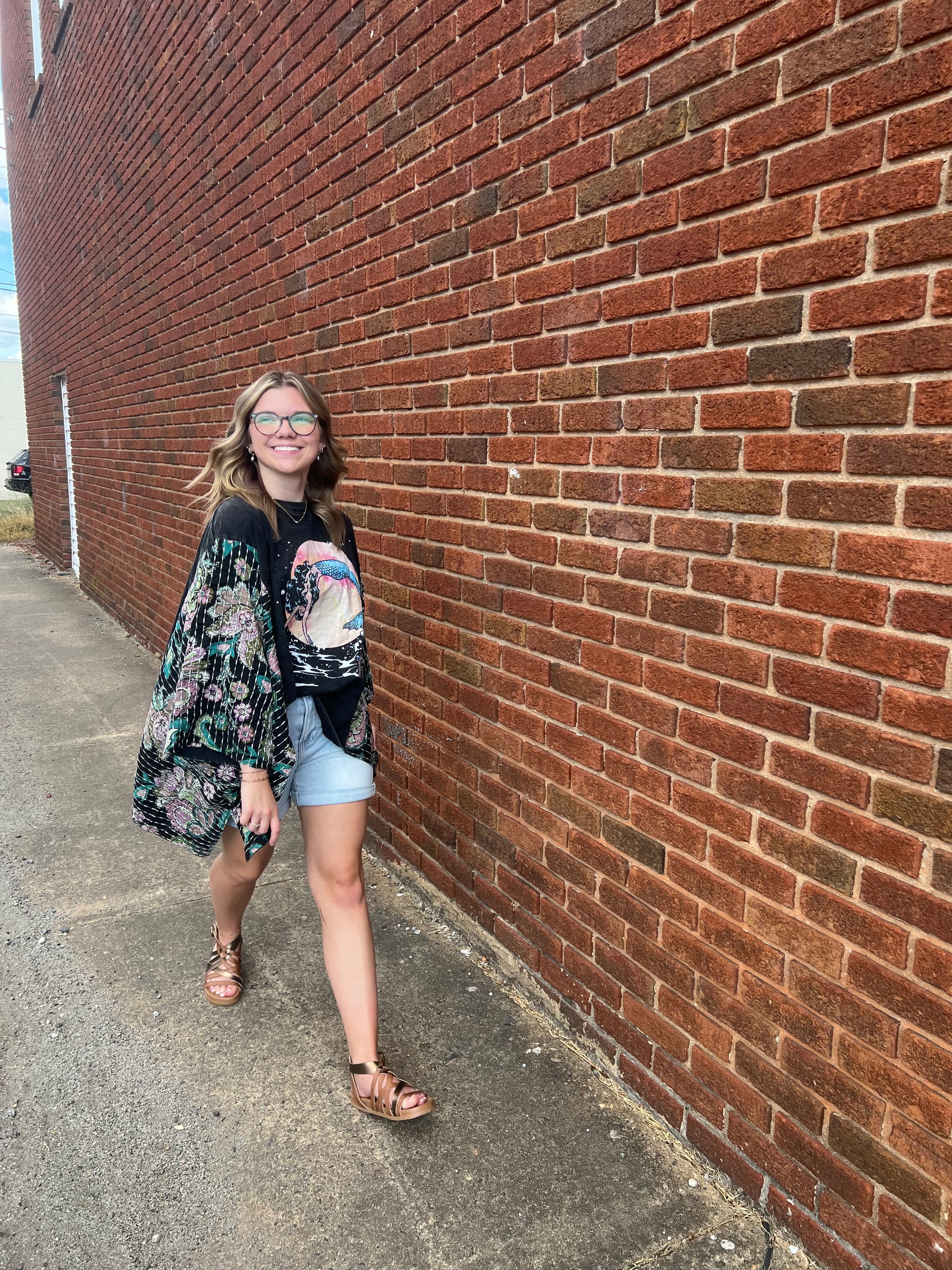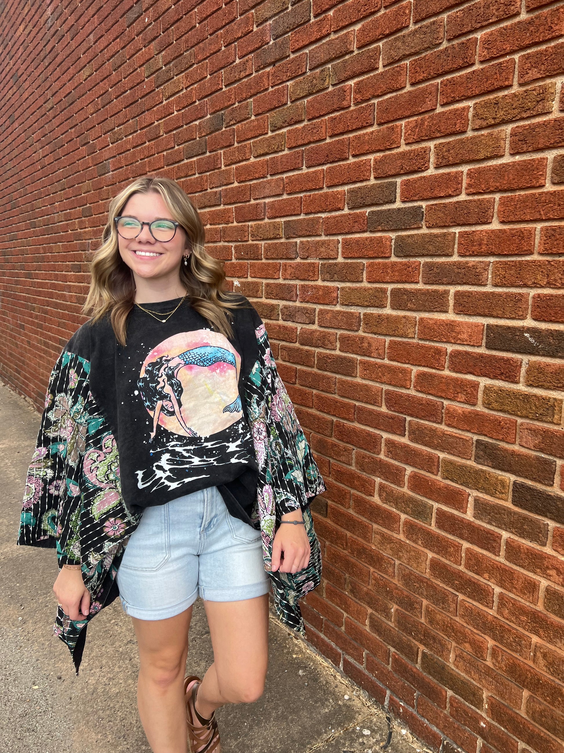 Bring boho/rock n roll vibes to your wardrobe with the Selene Moon Poncho Top. Featuring a playful mermaid print and relaxed poncho sleeves, this stitched top flows effortlessly for a breezy, carefree vibe. Perfect for layering or wearing solo, it adds whimsical charm and comfort to any day. Dive into style and let your inner mermaid shine!