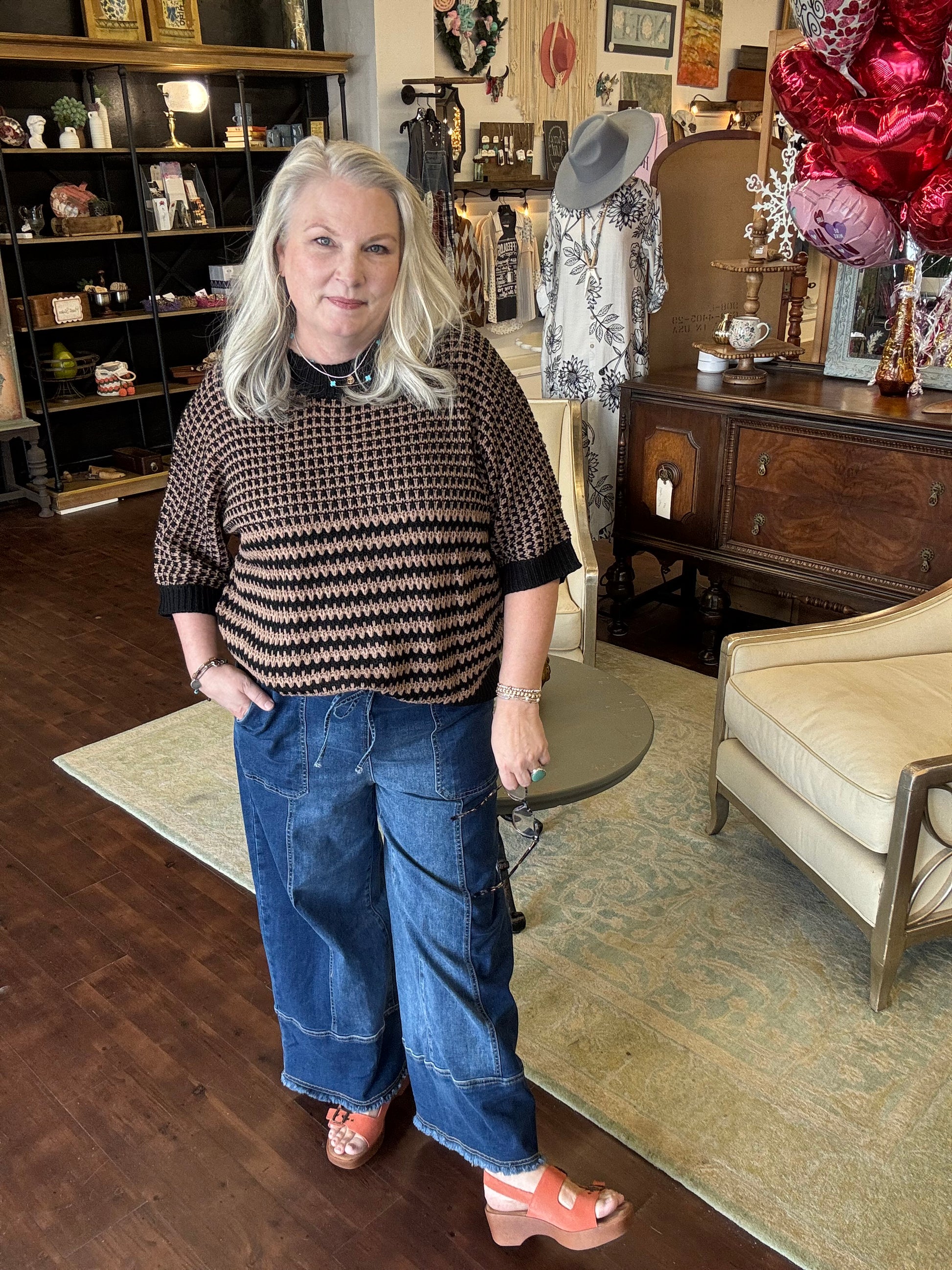 Effortlessly chic and undeniably cozy, this slouchy striped sweater is your new go-to for laid-back style. The oversized fit drapes beautifully while 3/4 sleeves add a soft, flowing silhouette that feels modern without trying too hard.