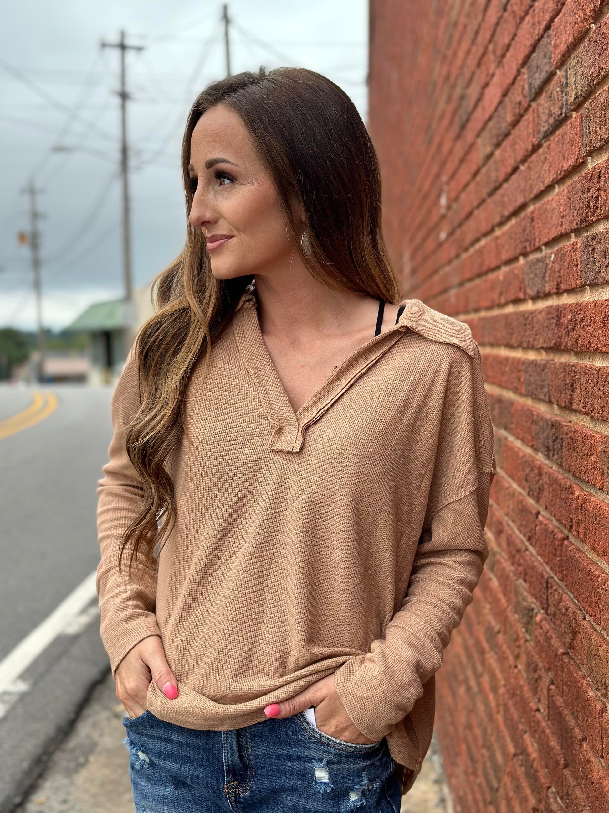 Look absolutely top-notch when you rock this waffley-good, collared top! Featuring a V neckline, frayed edges, and a cozy, relaxed fit, this is the perfect choice for those casual days when you still wanna look on-point. Don't forget the drop shoulder and long sleeves - it's gotta be a top pick! (See what we did there?)