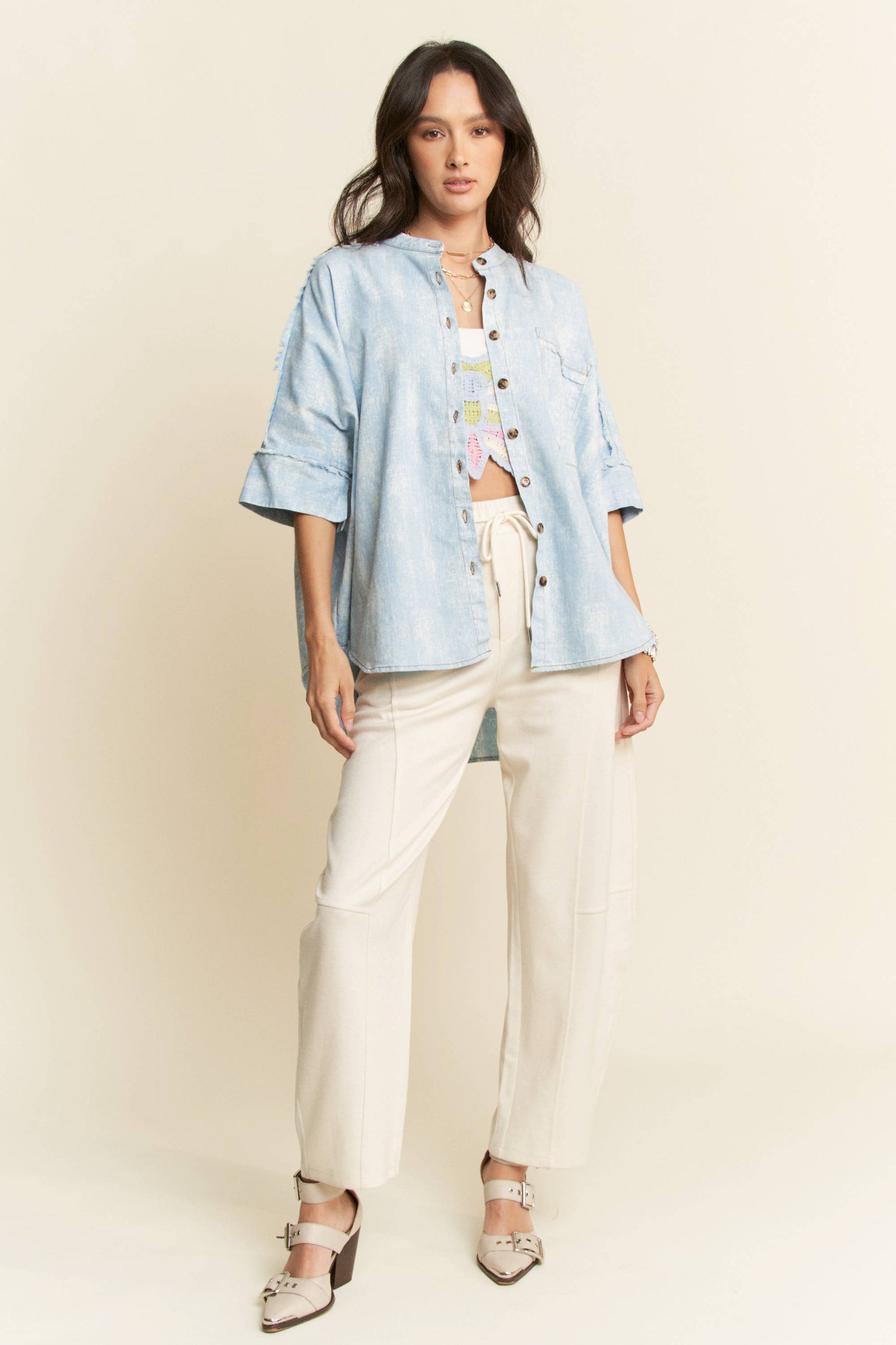Embrace laidback style with the Cassidy Chambray Top. Made from soft, washed denim, this top features a stand collar, pleat back detail, and fringe hem for a relaxed fit. Perfect for any casual occasion, give your wardrobe a playful twist with this must-have shirt top.