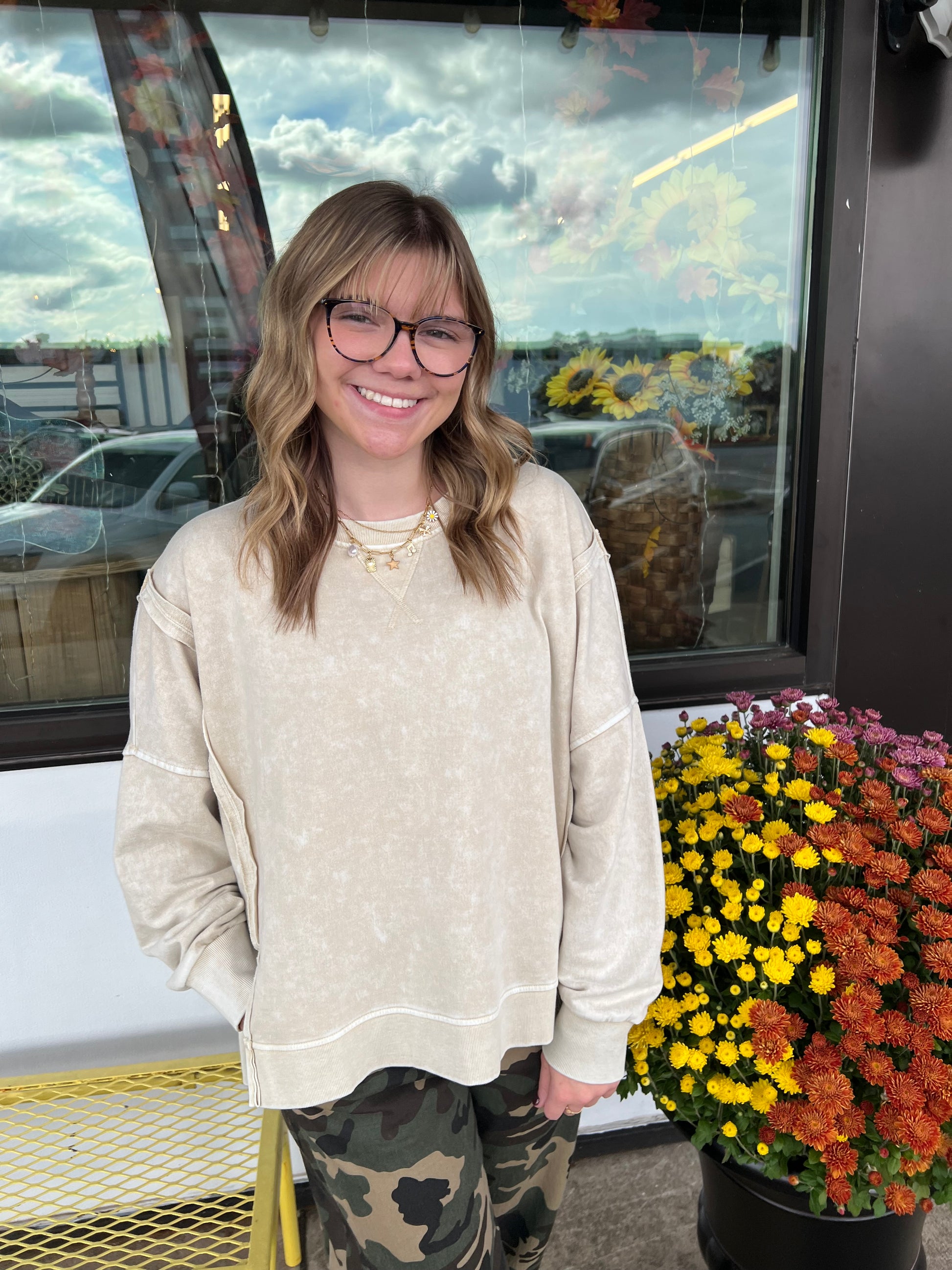 Get cozy with our Comfy Day Sweatshirt in Oatmeal, featuring a relaxed crewneck and extended shoulder patchwork for an effortlessly cool vibe. Long sleeves and acid-washed tones that vary make each piece uniquely yours, perfect for lounging or casual outings with a playful twist.