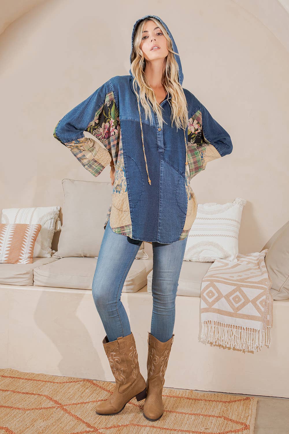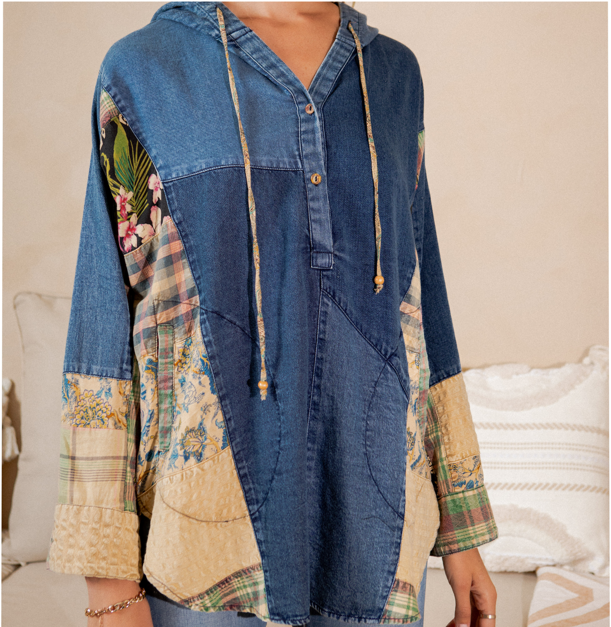 A full-sleeved button-down shirt with an oversized fit, blending trendy and bohemian vibes. Made with a combination of durable denim and comfortable cotton fabrics, this hoodie is the perfect mix of style and comfort. Intricate patchwork detailing adds a unique and eclectic touch to the regular fit, maintaining a classic silhouette. With an overdyed finish, the fabric boasts a luxurious feel and added depth. Designed for all-day comfort, the relaxed fit and breathable fabric blend make this hoodie a must-have. The hooded design and full sleeves enhance comfort and visual appeal, while the luxurious overdyed finish makes it a standout in any wardrobe.