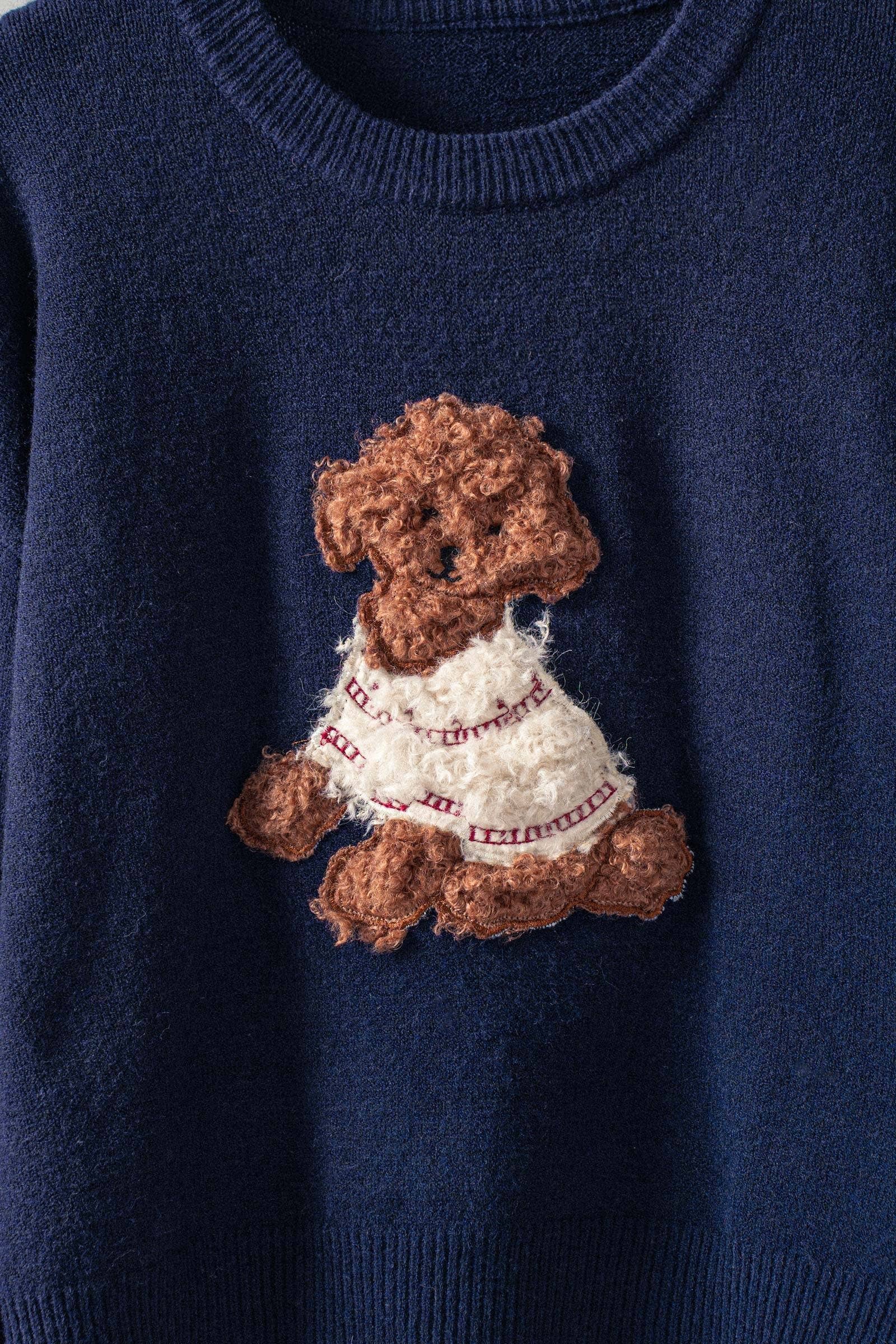 Add playful charm to your look with this cozy knit sweater featuring a textured 3D puppy embroidery. Perfect for layering over denim or pairing with skirts for a relaxed, fun statement.